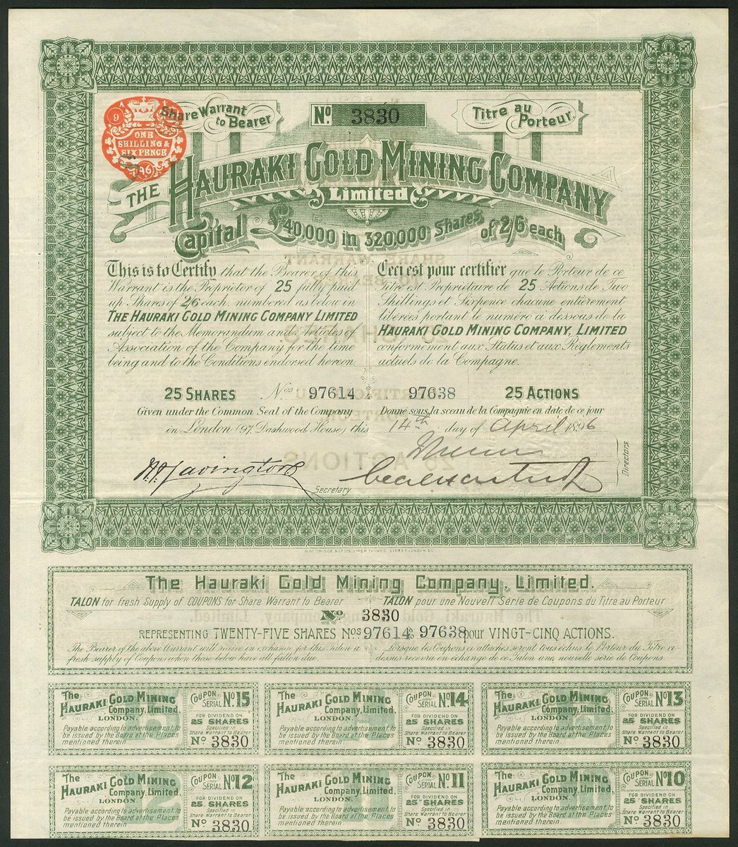 New Zealand: Hauraki Gold Mining Co. Ltd., bearer warrant for 25 shares of 2/6d, 189[6], #3830, ornate border, green, text in English and French, with coupons. GVF.