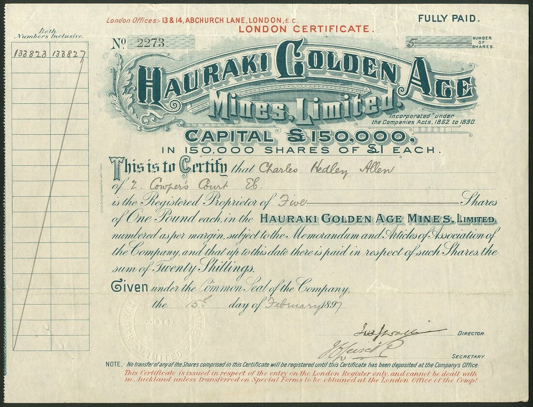 New Zealand: Hauraki Golden Age Mines Limited, £1 shares, 189[7], #2273, green, red overprint 'LONDON CERTIFICATE'. GVF and rare.