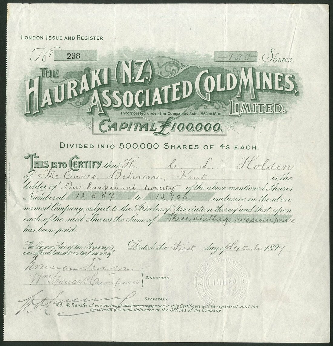 New Zealand: Hauraki (N.Z.) Associated Gold Mines Limited, 4/- shares, London register, 189[7], #238, green. GVF and rare.
