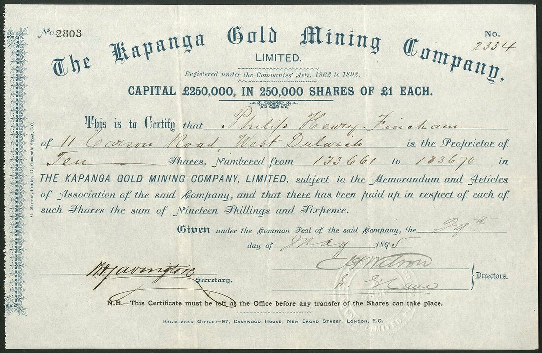 New Zealand: Kapanga Gold Mining Company Limited, £1 shares, 19/6d paid, 189[5], #2803, green. A reconstruction of a company of the same name. See previous lot. VF.