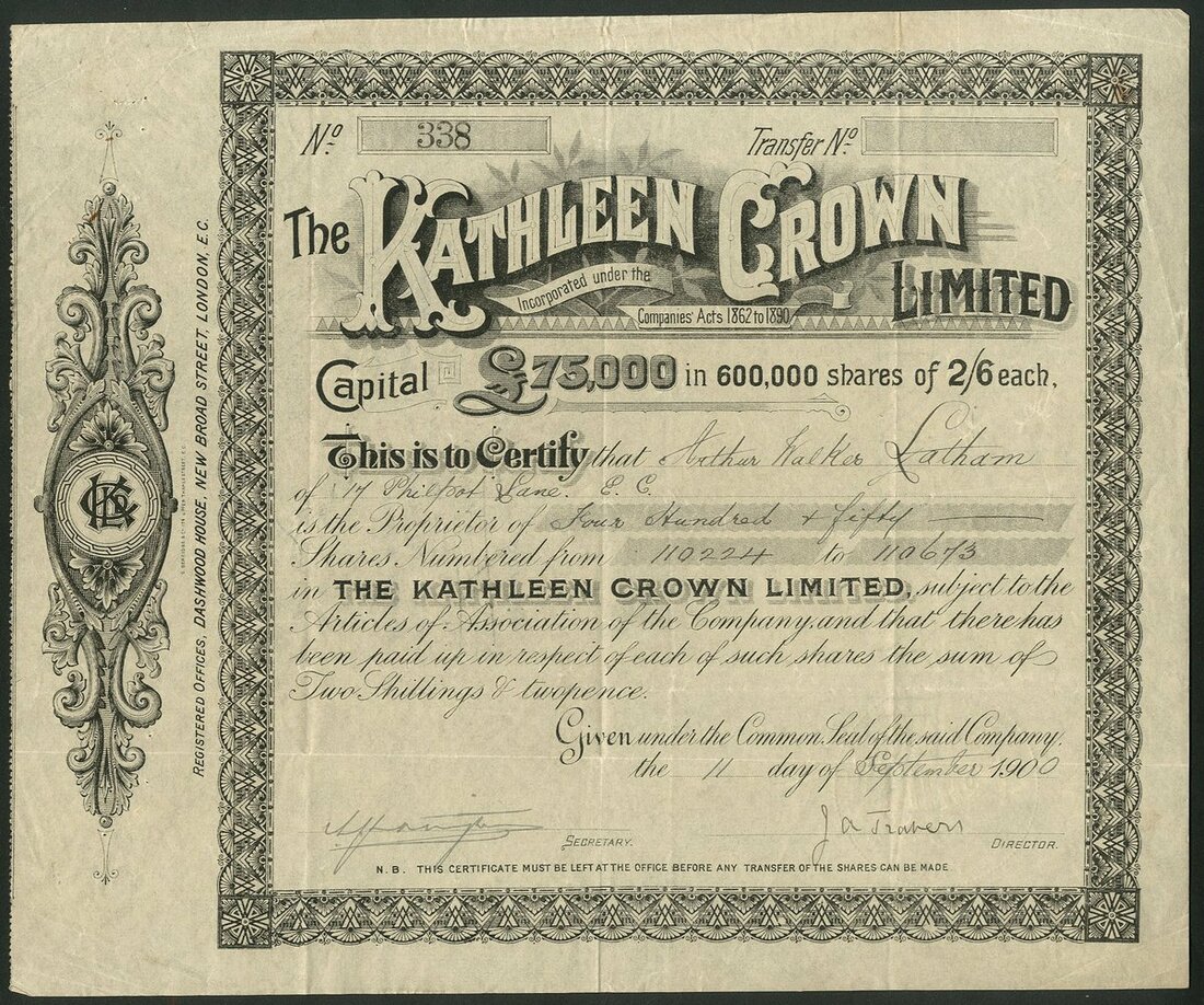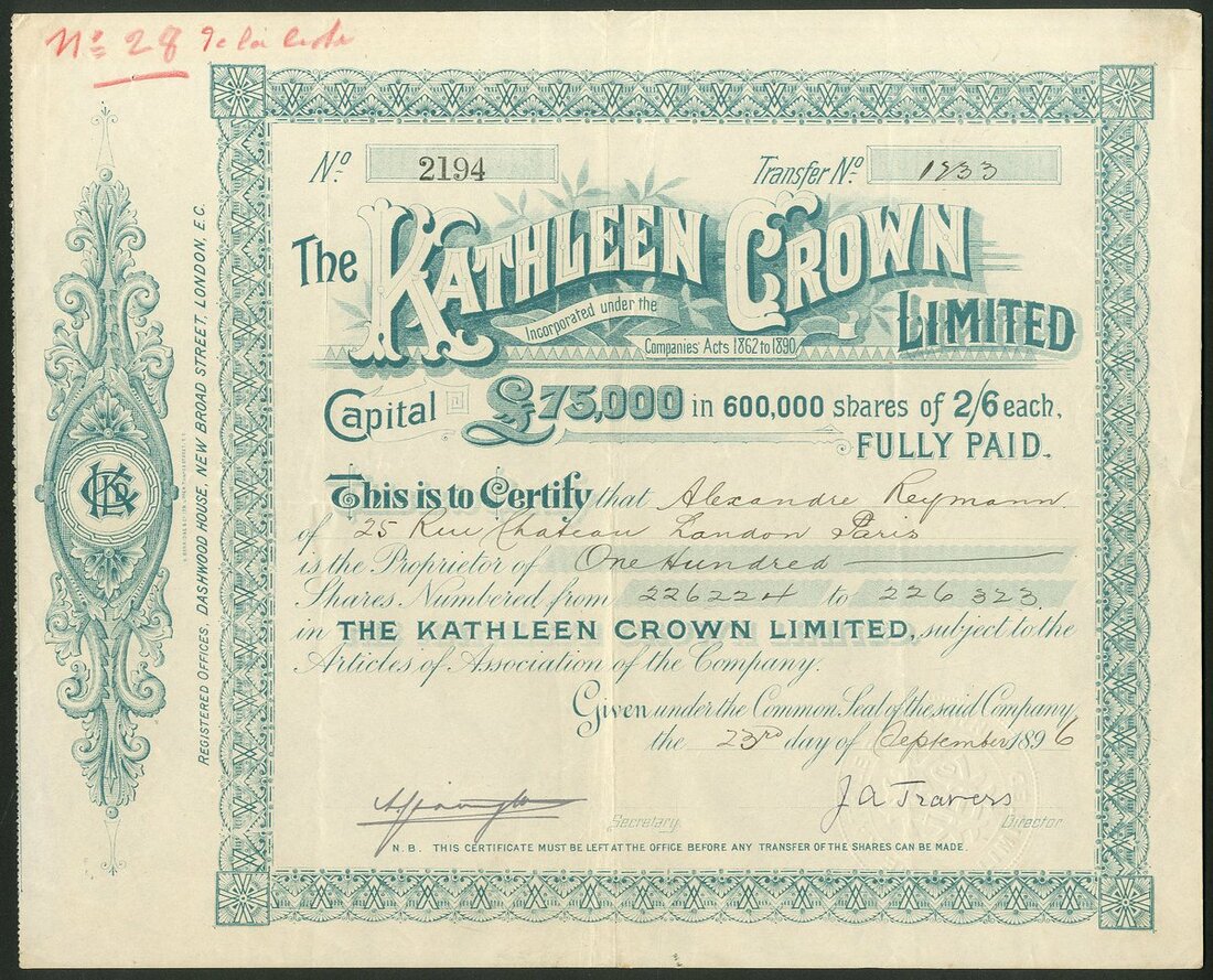 New Zealand: Kathleen Crown Ltd., pair of certificates for shares of 2/6d, the first fully paid, 189[6], #2194, blue-green, the second 2/2d paid, 190[0], #338, both of the same design with scrollwork at left, ornate borders. VF (2).