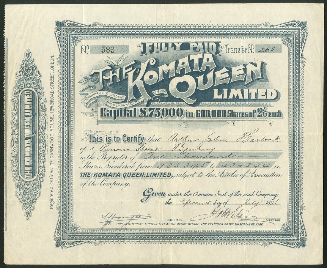 New Zealand: Komata Queen Limited, 2/6d shares, 189[6], #583, ornate border, blue. VF and first time at auction.