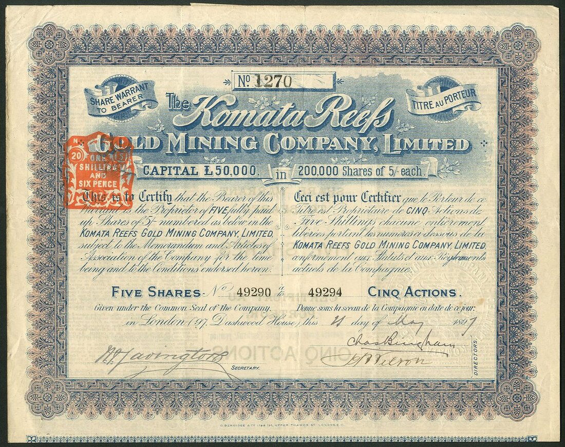 New Zealand: Komata Reefs Gold Mining Company Limited, 5 shares of 5/-, 189[7], #1270, ornate border, pink and blue, with coupons. Formed in 1895 to acquire the Komata, A.I. and Queen's Birthday claims in the Hauraki Mining District.. GVF and rare type not seen before in auction.