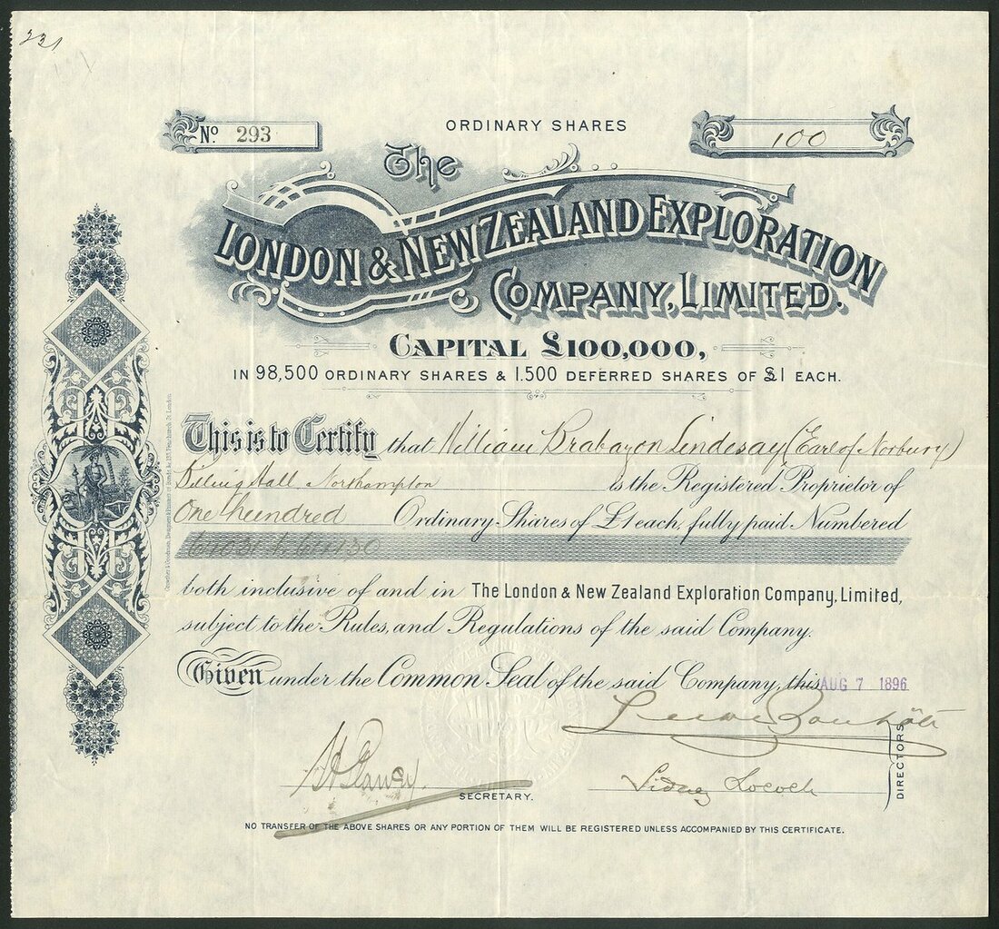 New Zealand: London & New Zealand Exploration Co. Ltd., £1 ordinary shares, [1896], #293, scrollwork at left depicts Maori with spear, blue-grey. GVF.