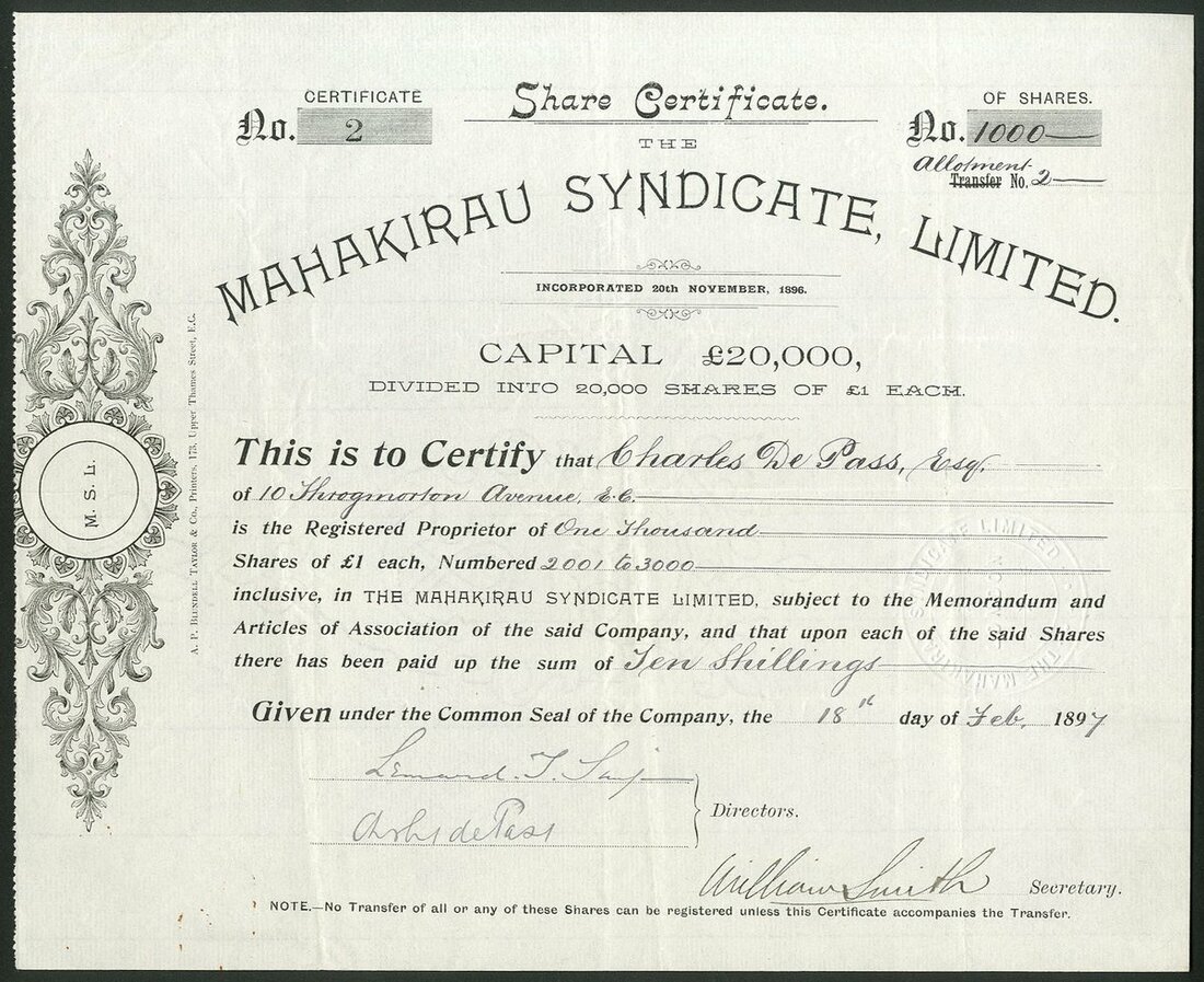 New Zealand: Mahakirau Syndicate Limited, £1 shares, 189[7], #2, scrollwork at left, black. GVF and first time at auction.