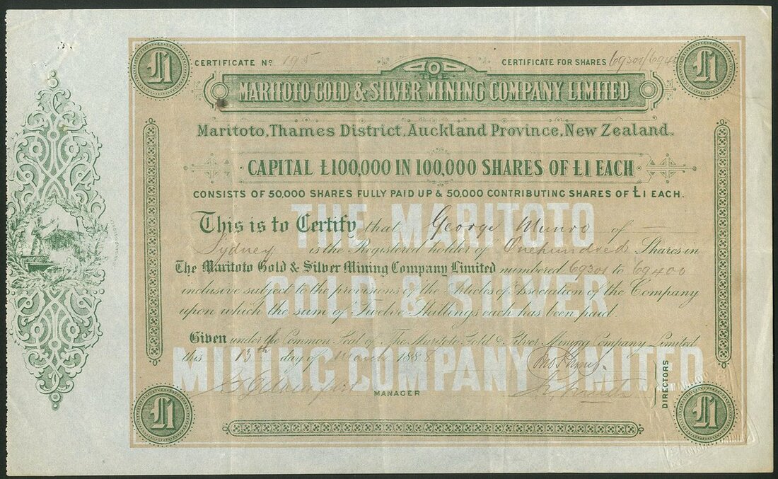 New Zealand: Maritoto Gold & Silver Mining Co. Ltd., Thames District, £1 shares, 12 shillings paid, 188[8], #195, very attractive piece printed in Sydney with scrollwork and small mine vignette at left, green with buff underprint, embossed seal. VF and rare. Sold by us at £85 in 2015.