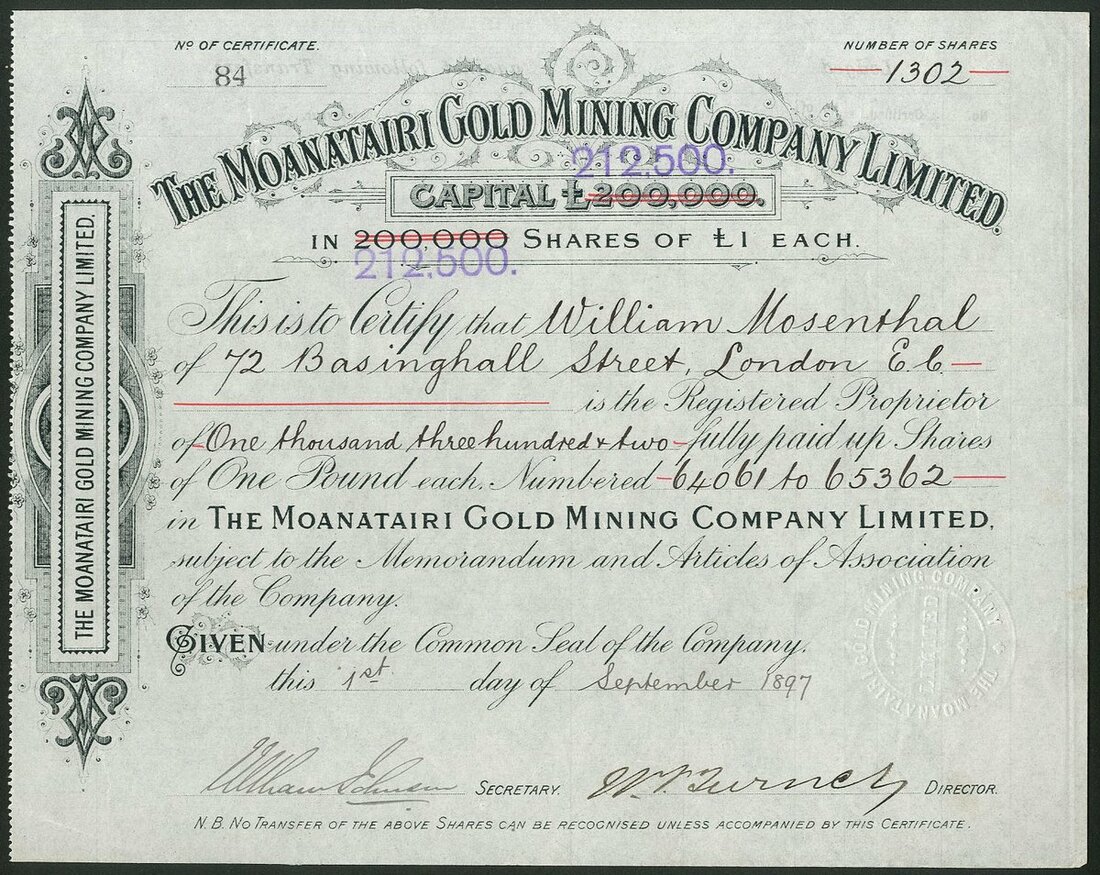 New Zealand: Moanatairi Gold Mining Co. Ltd., £1 shares, [1897], #84, black, capital overprinted with increase. GVF and rare.