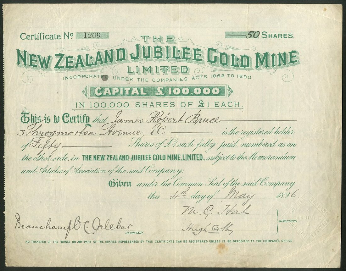 New Zealand: New Zealand Jubilee Gold Mine Ltd., £1 shares, 189[6], #1269, green printing. Formed to work 'The Jubilee' mining claim in the Upper Thames District, North Island. VF.
