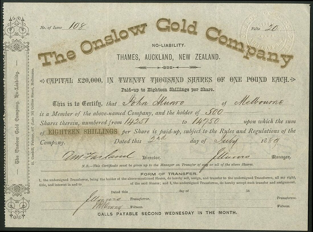 New Zealand: Onslow Gold Company NL, Thames, Auckland, New Zealand, £1 shares, 18 shillings paid, 18[89], #108, gold and black, printed in Melbourne. AEF and rare early New Zealand piece.