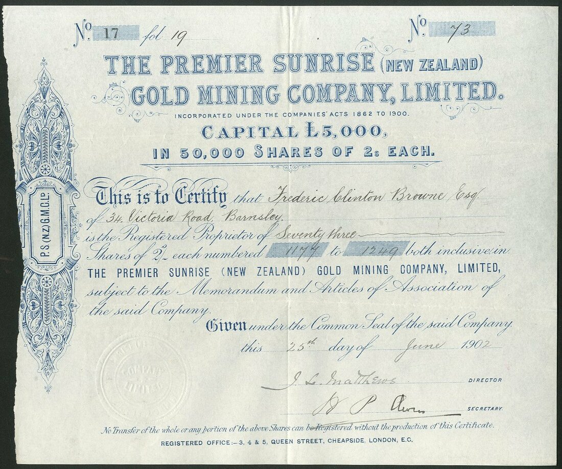 New Zealand: Premier Sunrise (New Zealand) Gold Mining Co. Ltd., 2/- shares, 190[2], #73, blue with scrollwork. GVF but left edge badly removed from counterfoil and irregular.