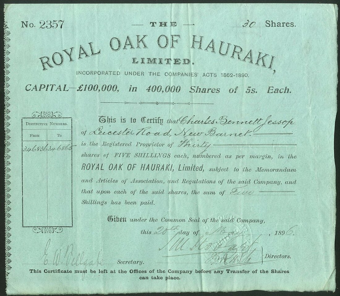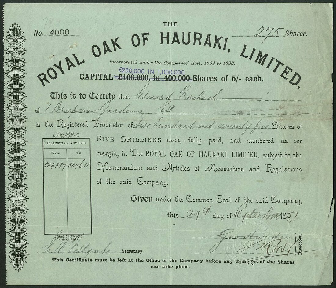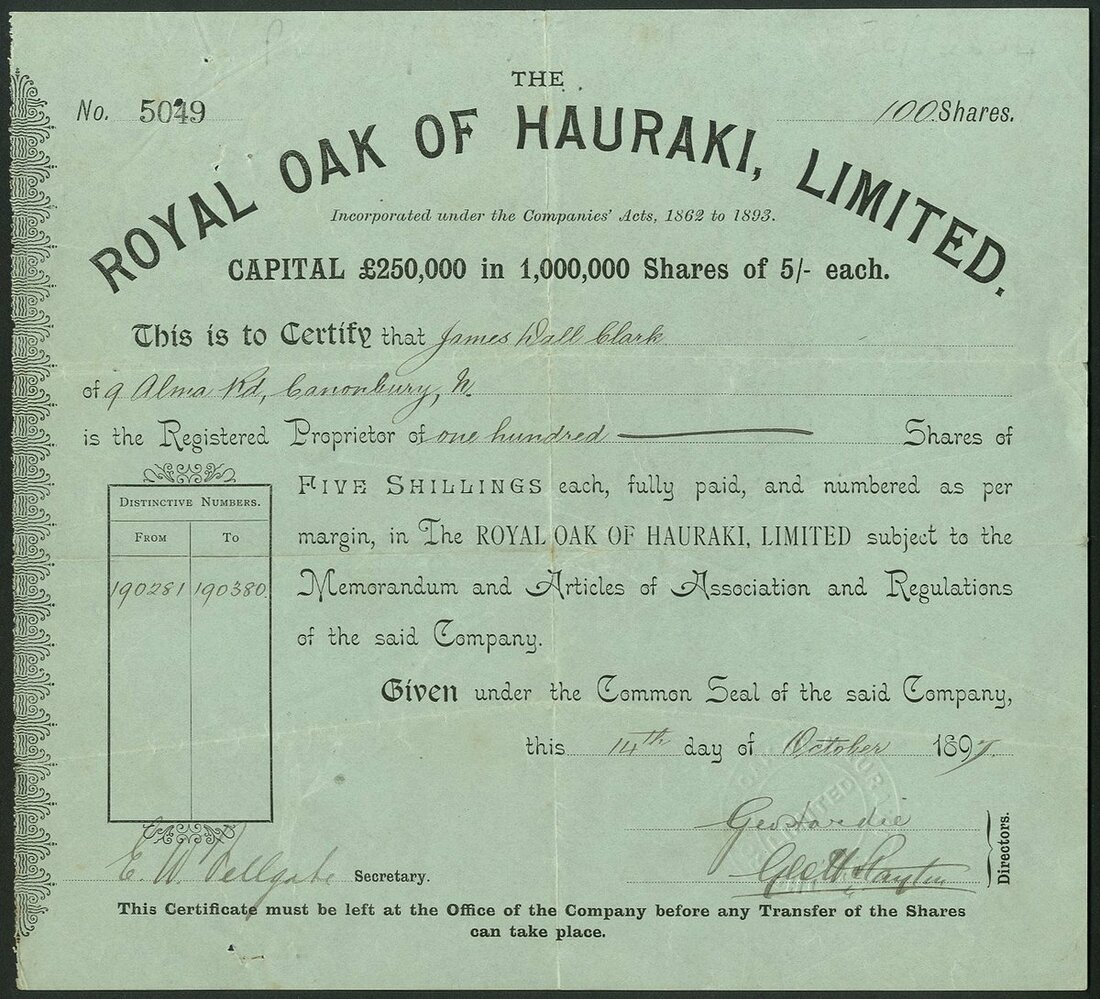 New Zealand: Royal Oak of Hauraki Ltd., a trio of certificates for 5/- shares comprising, 189[6], #2357m capital £100,000, 189[7], #4000 with overprint of capital to £250,000, and, 189[7], #5049, capital now £250,000. All black on blue to blue-green paper. VF and better but the 2nd has small tear at right edge (3).