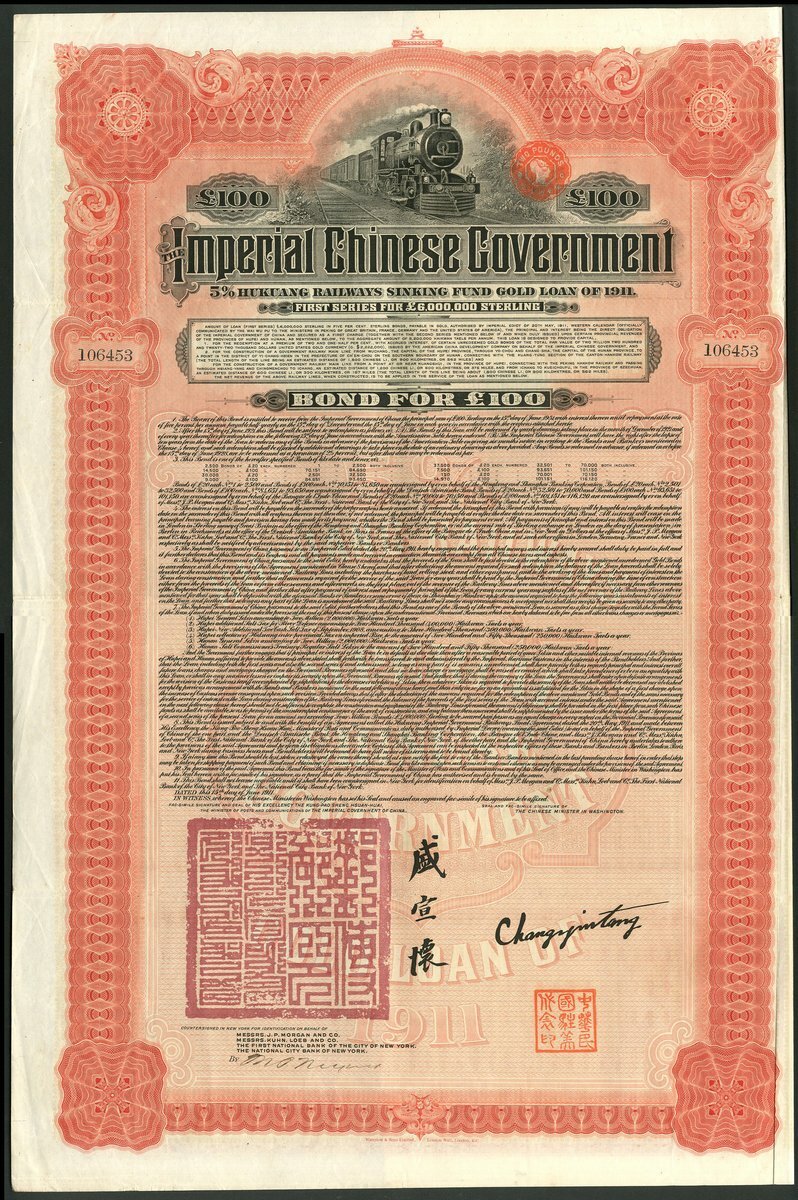 China: 1911, 5% Hukuang Railways 5% Gold Loan, a bond for £100, issued by the American banks syndicate, #106453, large format, steam train at top, red and black, with coupons. VF.