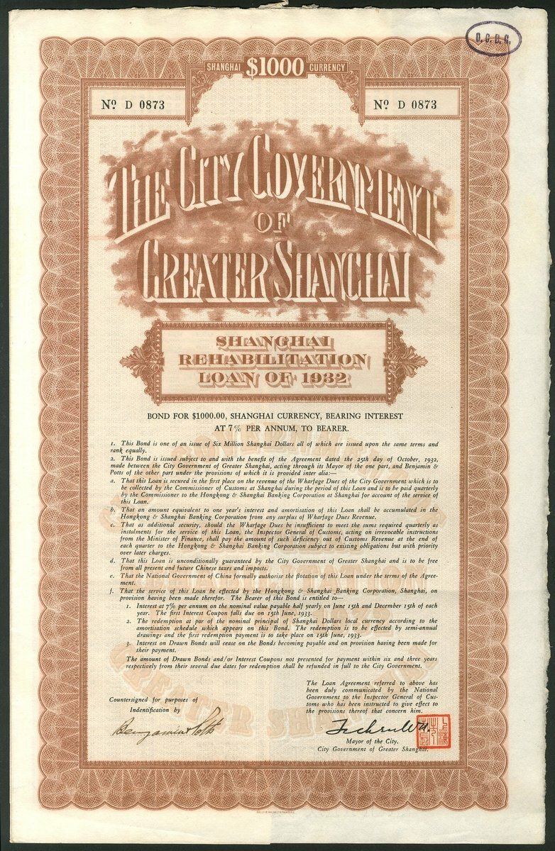 (x) China: City Government of Greater Shanghai, 7% Shanghai Rehabilitation Loan, 1932, bond for $1000 (Shanghai currency), #D00873, large format piece with ornate borders, brown and black, text all in English, with coupons. AEF.