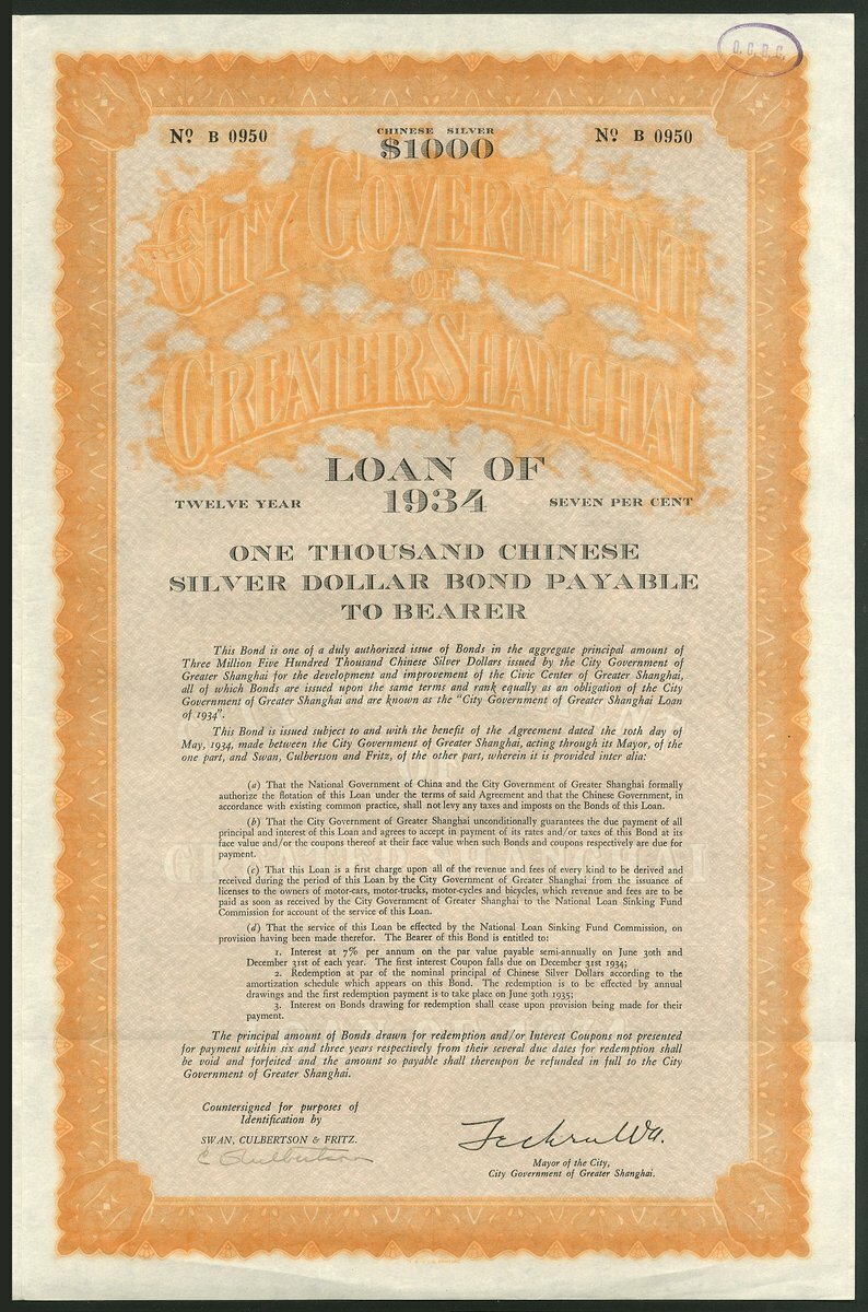 (x) China: City Government of Greater Shanghai, 7% Loan of 1934, bond for $1000 Chinese Silver, #B0950, ornate border and titles, orange and black, with coupons. AEF.