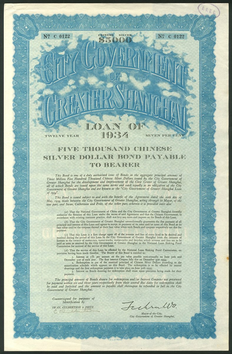 (x) China: City Government of Greater Shanghai, 7% Loan of 1934, bond for $5000 Chinese Silver, #C0122, ornate border and titles, blue and black, with coupons. AEF, scarce top denomination.