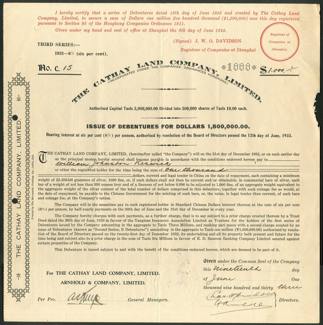 China: Cathay Land Company Ltd., 6% debenture for [1000] taels, 1933, 3rd series, #C15, large format piece printed in black and red, grey paper, embossed seal. Only a few hundred of this series issued. Some 'nibblins' at right edge, VF and rare.