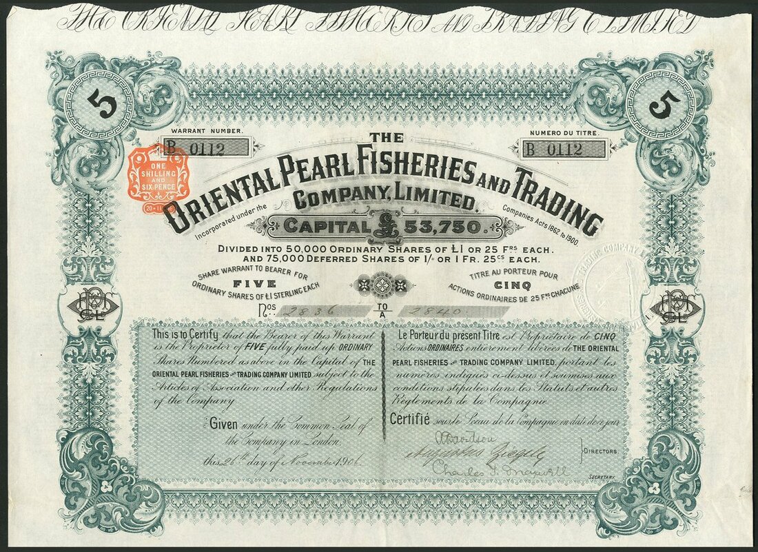 Ceylon/India/Persian Gulf: Oriental Pearl Fisheries and Trading Company Limited, 5 ordinary shares of £1, London 19[06], #B0112, ornate border, green and black, with coupons. We cannot find an exact location for this company but 'oriental' pearls mostly come from the Persian Gulf. EF and rare.