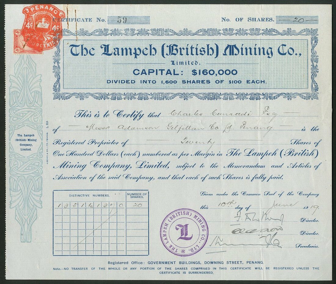 Malaya: Lampeh (British) Mining Co. Ltd., $100 shares, 19[19], #59, attractive blue printing on bluish paper, printed in Penang, adhesive Straits revenue stamp tied with embossed Penang duty stamp. Rust mark at top edge otherwise GVF and rare.