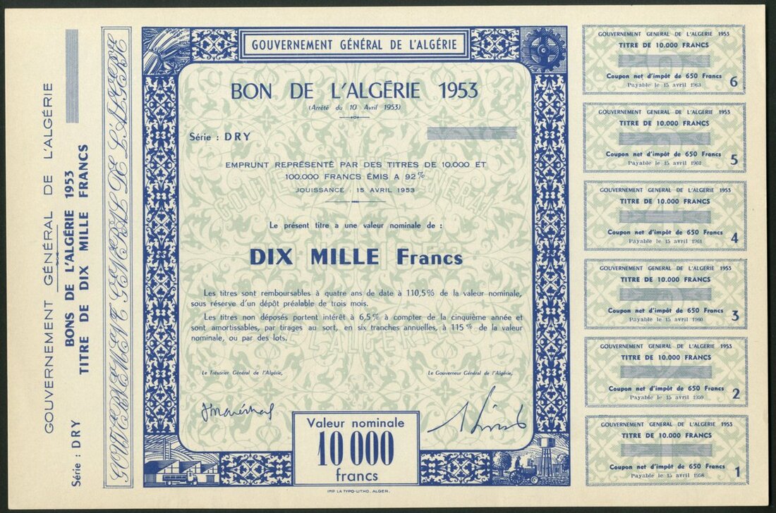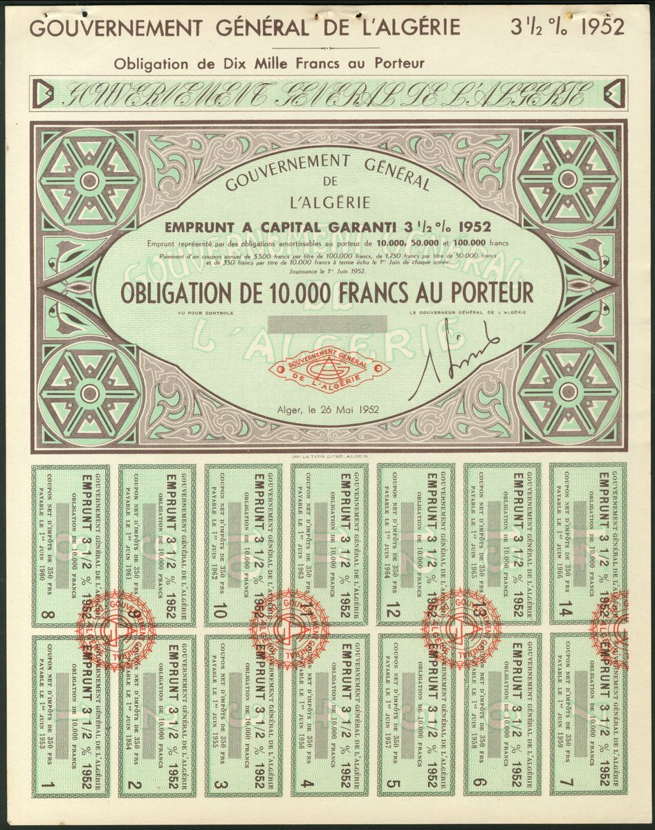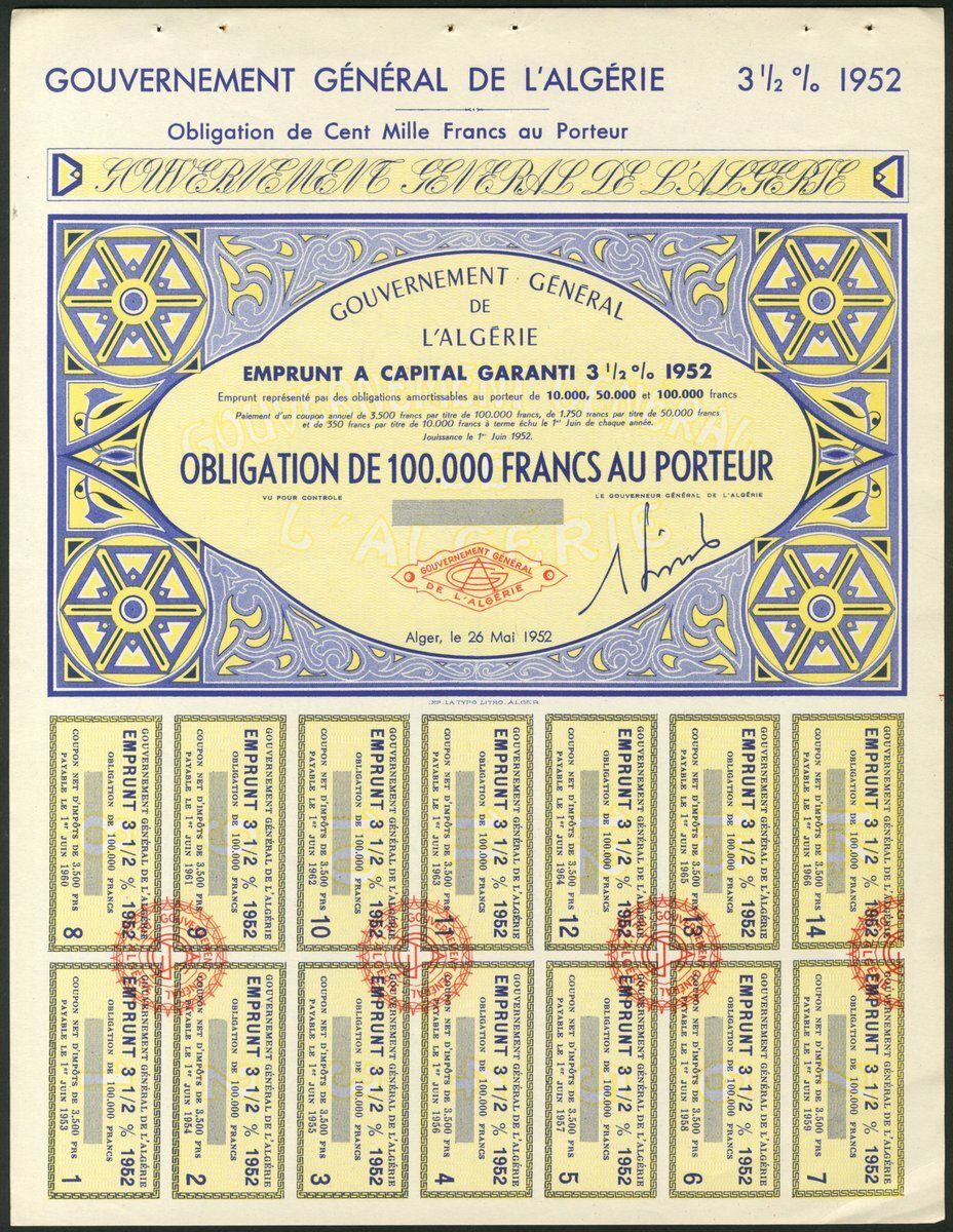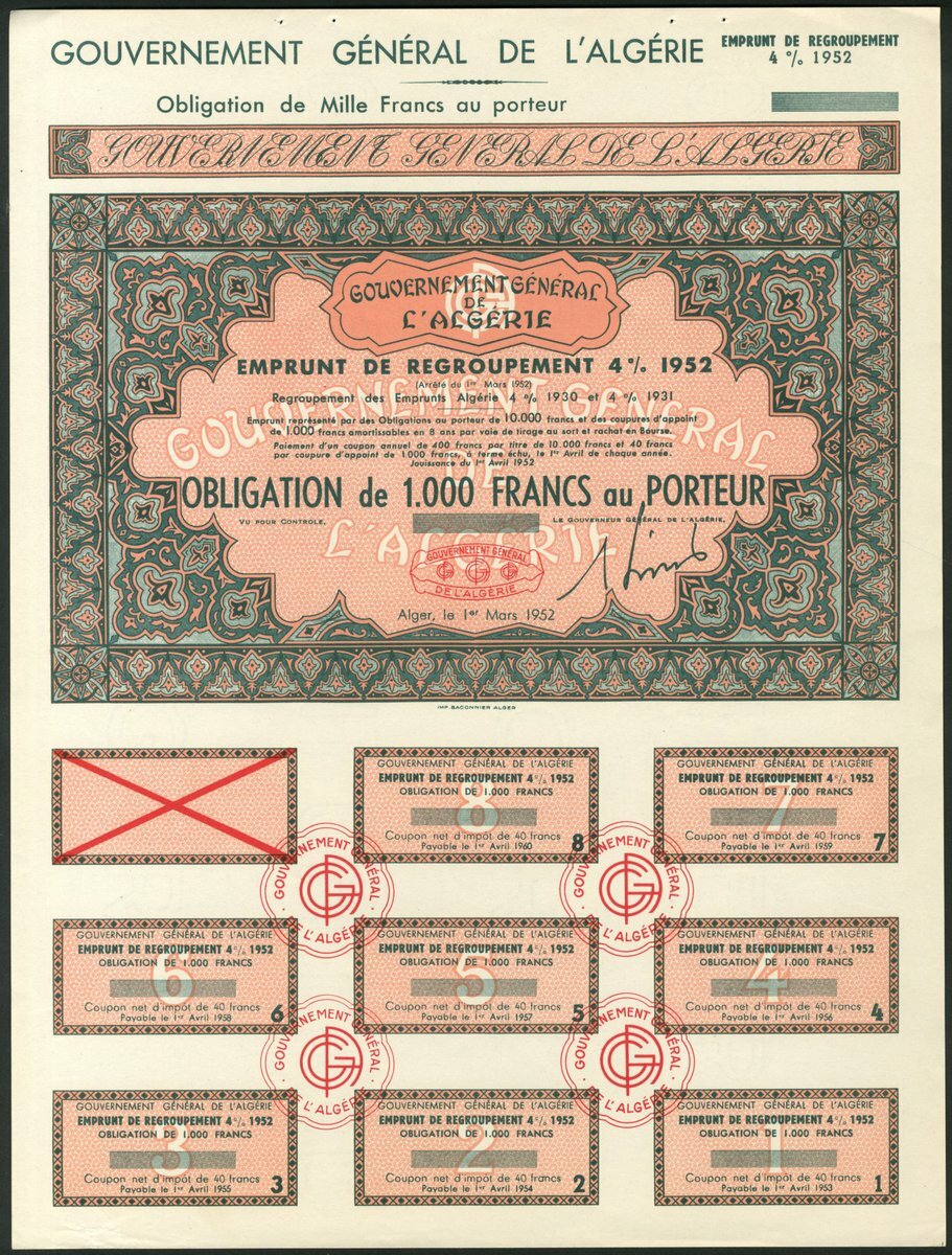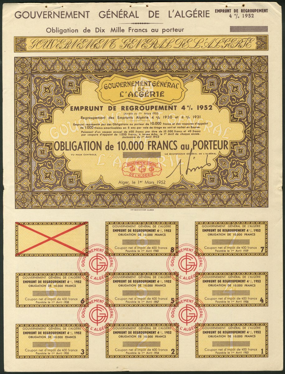 Algeria: 1952 3½% Guaranteed Loan, unissued bonds for 10,000 francs (2) and 100,000 francs, together with 1952 4% Consolidation Loan, unissued bonds for 1000 francs and 10,000 francs (2), and, 1953 6.5% Loan, unissued bond for 10,000 francs, small format, all with ornate borders, various colours, with counterfoils. VF-EF (7). NO RESERVE.