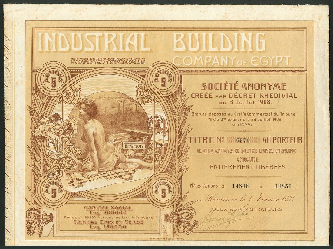 Egypt: Industrial Building Company of Egypt, 5 shares of £4, Alexandria 1912, #6970, very attractive French style piece with nude female at left with depictions of 'labour' and 'industry' behind, yellow and brown, with coupons. Some tone spots, GVF.