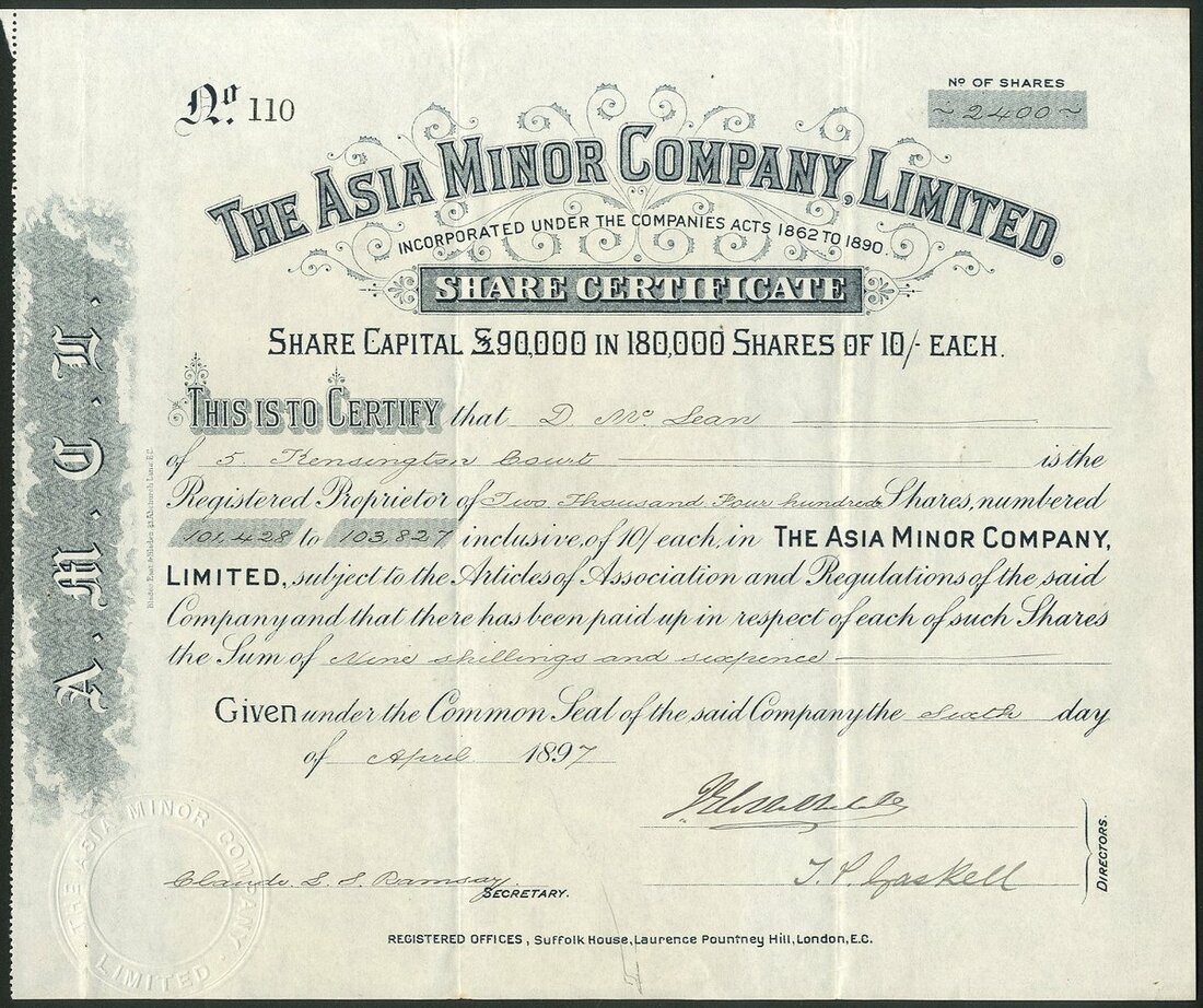 Ottoman Empire: Asia Minor Company Limited, 10 shilling shares, part paid, 189[7], #110, signed by Admiral John E. Commerell V.C. as director, dark blue. Formed to acquire mines in the province of Sivas, Central Turkey. GVF and rare.