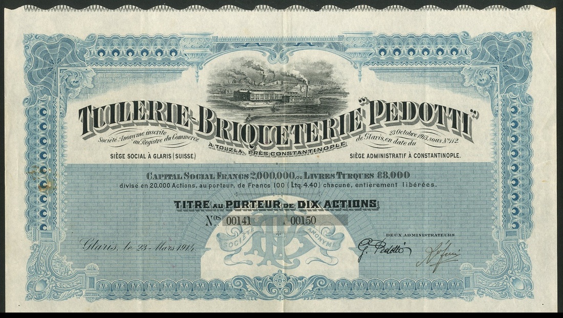 Ottoman Empire/Switzerland: Tuilerie-Briqueterie "Pedotti" a Touzla, 10 shares of 100 francs, Glaris 1914, 00141-00150, vignette of brick and tile factory alongside river, blue and black, with coupons, printed by Bradbury, Wilkinson. GVF and scarce.