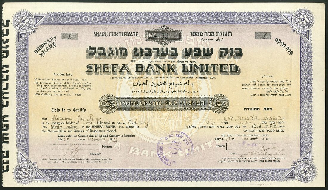 Palestine: Shefa Bank Limited, one ordinary share, 19[32], #39, ornate border, blue and black, yellow underprint, with coupons. EF and rare.