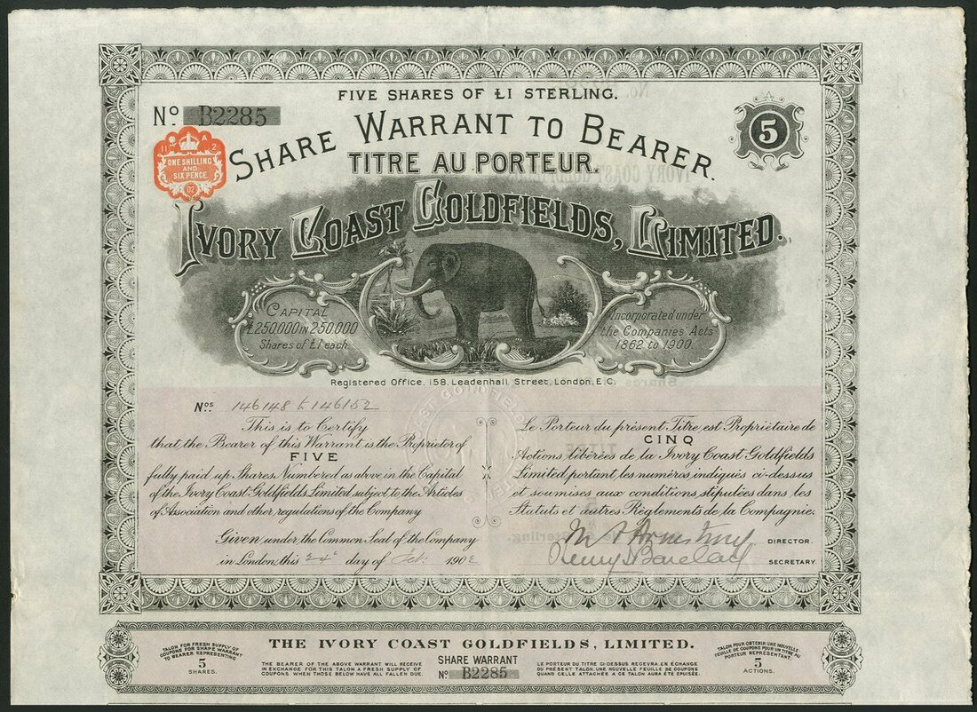 Ivory Coast: Ivory Coast Goldfields Ltd., bearer warrant for 5 shares of £1 each, 190[2], #B2285, elephant in centre, ornate border, black with pink underprint, with coupons. Registered in 1901 to acquire shares in French companies owning concessions in French West Africa and also mining claims in the Sanwi and Indenie districts. GVF.