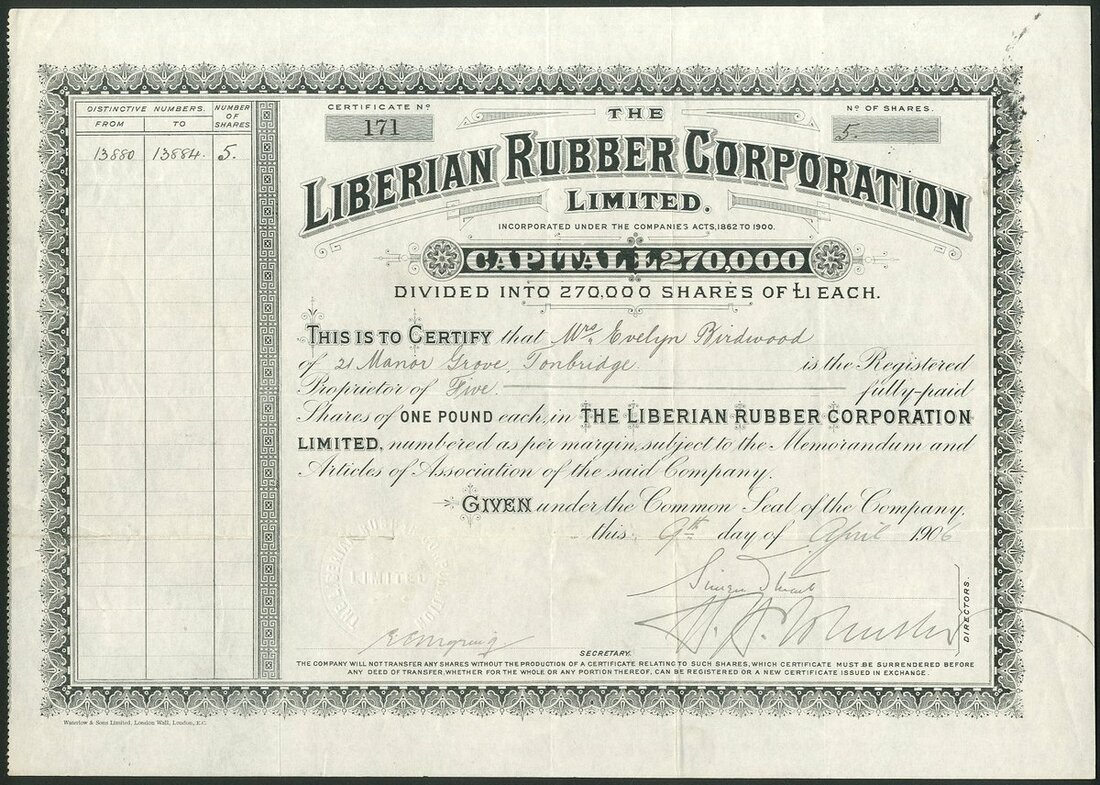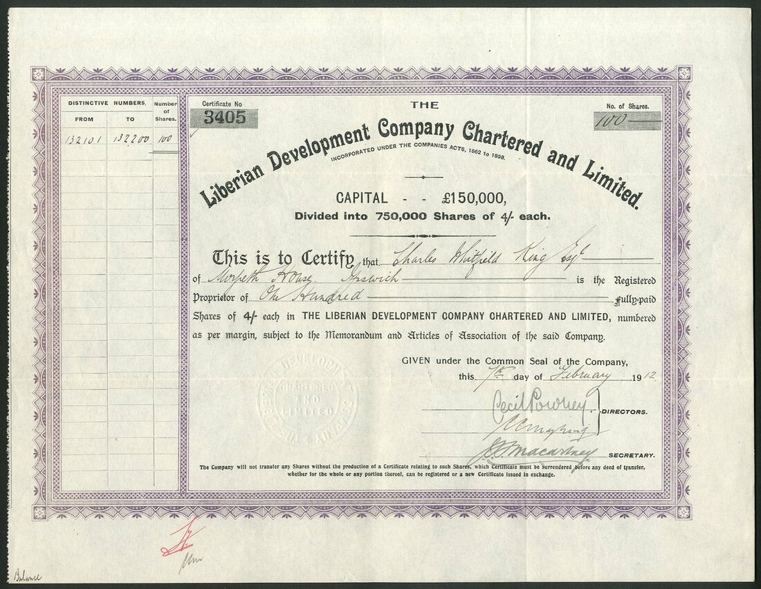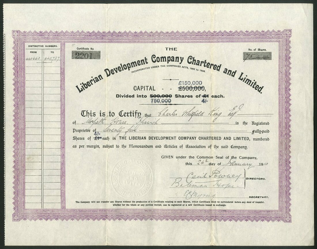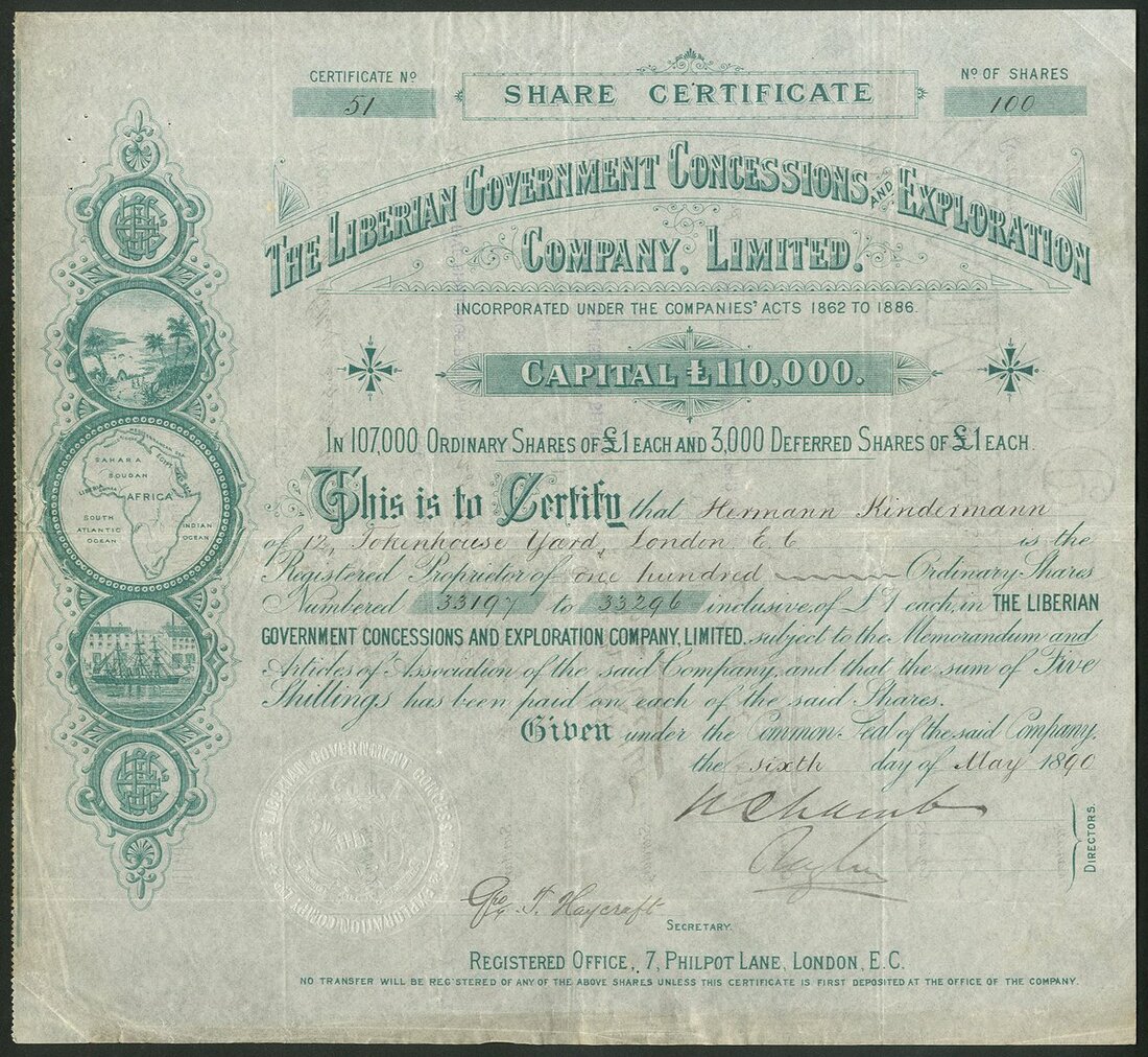 Liberia: A collection of certificates comprising: Liberian Government Concessions and Exploration Co. Ltd., 18[90], #51; Liberian Diamond & Gold Trust Limited, 2 types, 19[12], #675 and 19[19], #1342; Liberian Development Company Chartered and Limited, 190[4], #3405, 19[10], #2201, with capital overprint and 19[12], #3405, and Liberian Rubber Corporation Limited, 2 types, 190[6], #171 and another with capital overprint, #167. An interesting group. Generally VF (8).