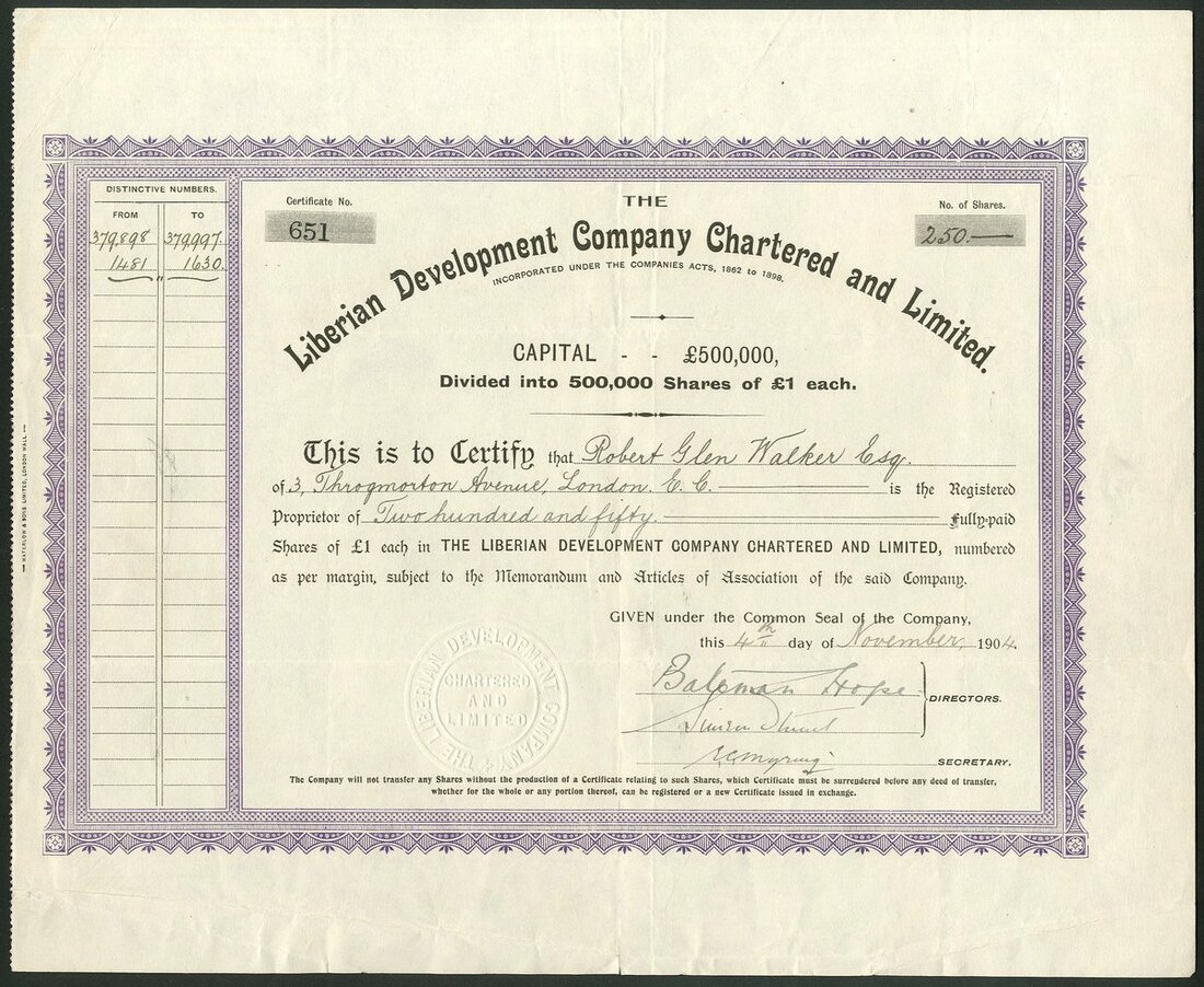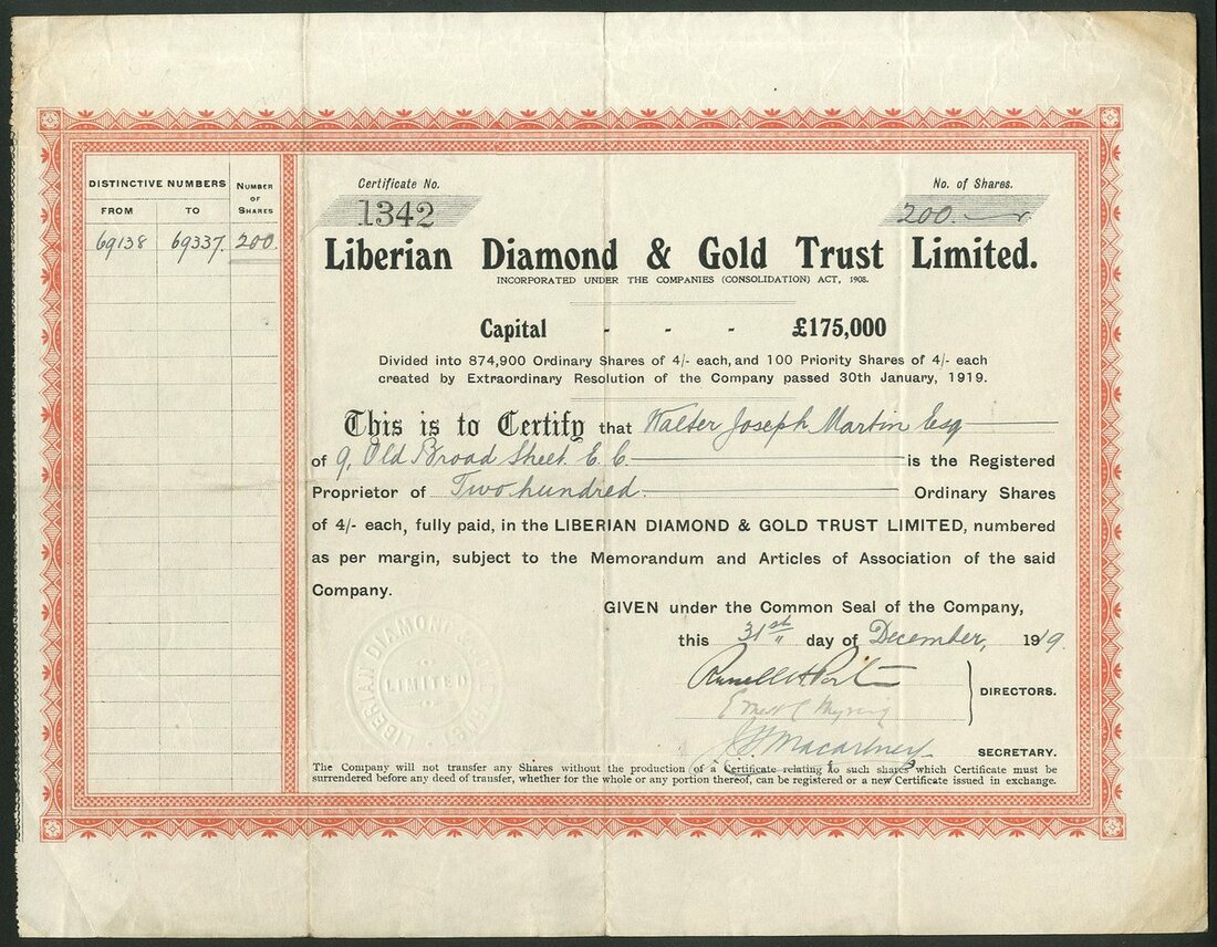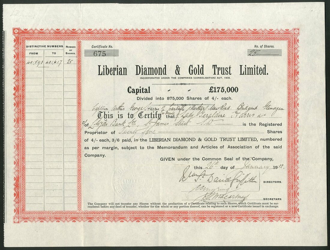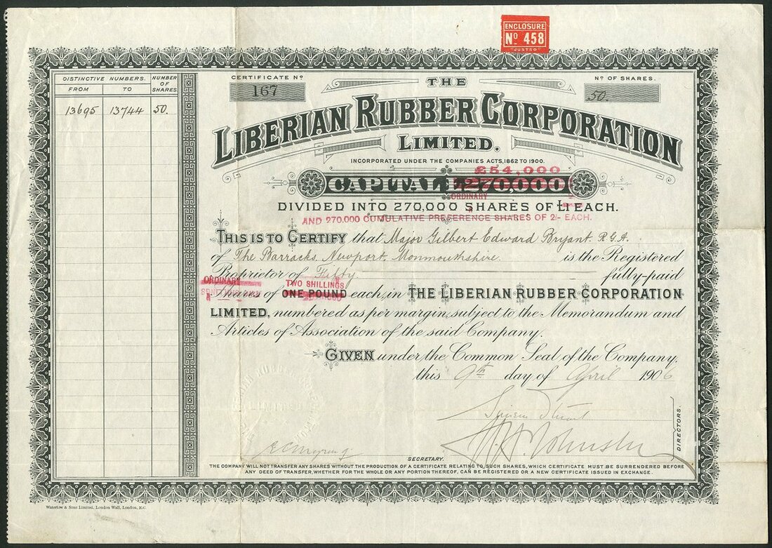 Liberia: A collection of certificates comprising: Liberian Government Concessions and Exploration Co. Ltd., 18[90], #51; Liberian Diamond & Gold Trust Limited, 2 types, 19[12], #675 and 19[19], #1342; Liberian Development Company Chartered and Limited, 190[4], #3405, 19[10], #2201, with capital overprint and 19[12], #3405, and Liberian Rubber Corporation Limited, 2 types, 190[6], #171 and another with capital overprint, #167. An interesting group. Generally VF (8).