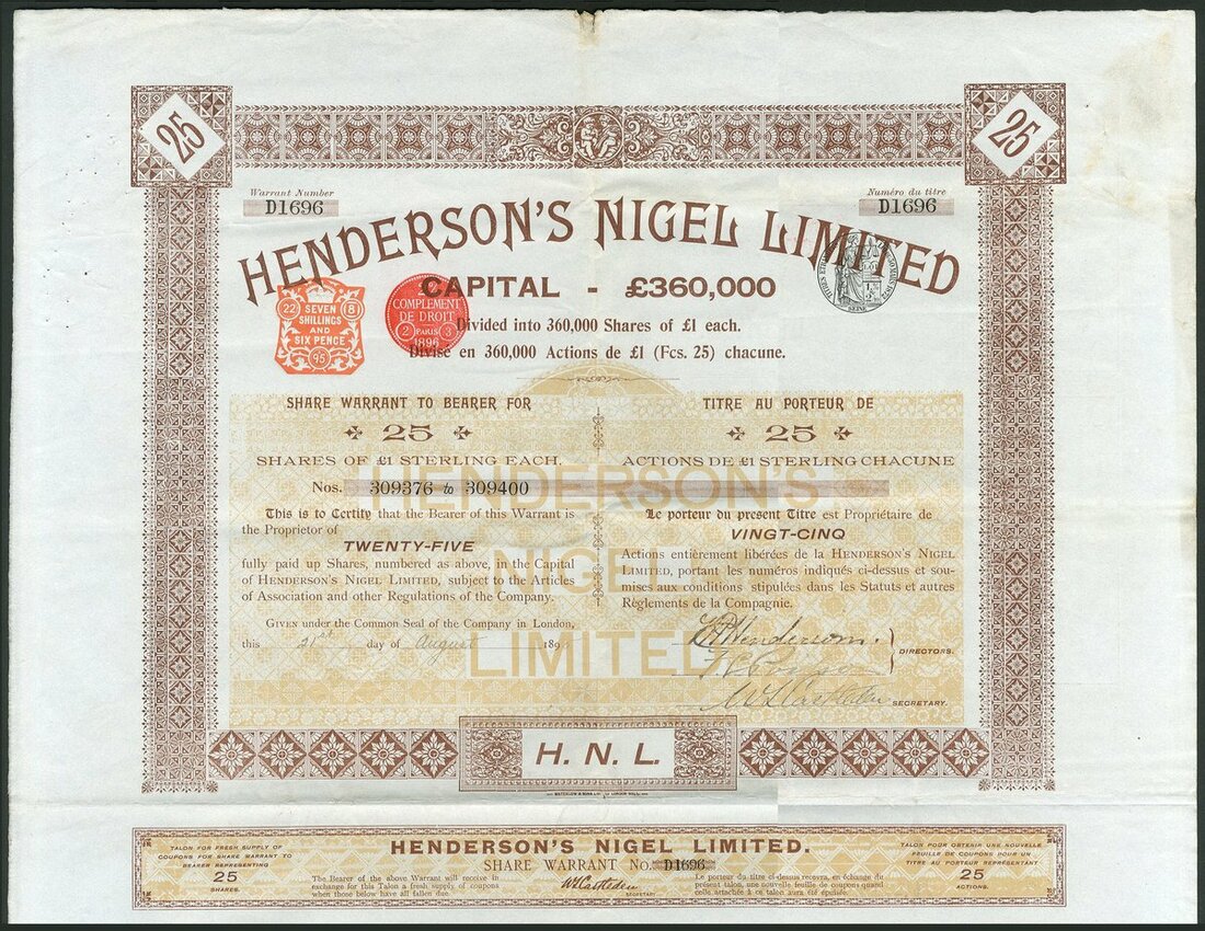 South Africa: Henderson's Nigel Ltd., 25 shares of £1 each, 189[5], #D1696, ornate border, brown, with coupons, text in English and French, printed by Waterlow. Claims located East of the Transvall Nigel and Nigel Gold Mines. Worn at top of centre fold, VF.