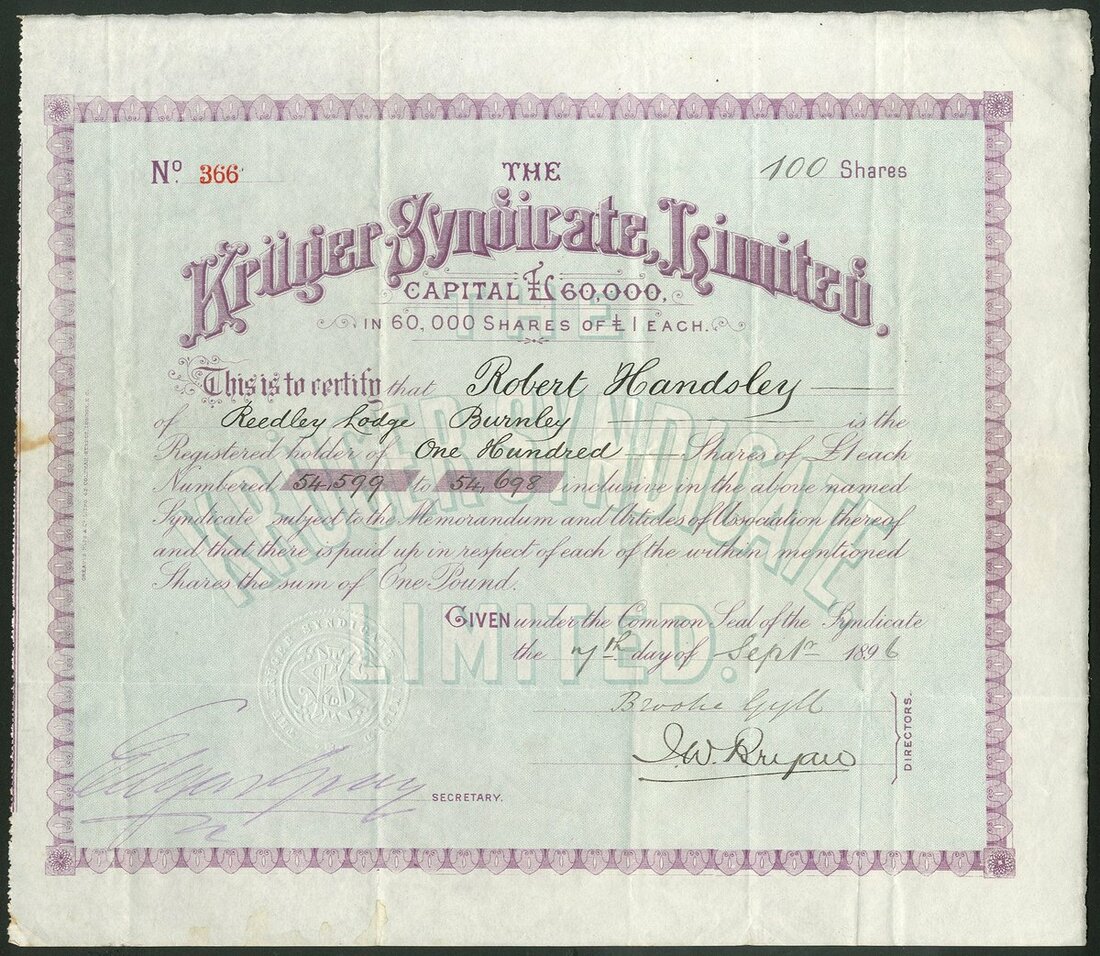 South Africa: Kruger Syndicate Ltd., £1 shares, 189[6], #366, ornate border, mauve with pale blue underprint. Registered 1895 to acquire 162 claims in the Rooderand Gold Fields. Also 7 concessions of 145,000 acres on the Gold Coast. Wound up 1897. Minor stain on edge, VF.