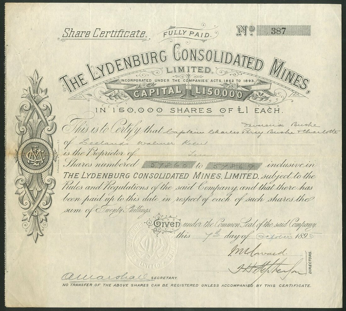 South Africa: Lydenburg Consolidated Mines Ltd., £1 shares, 189[5], #387, decorative black printing. Located in the Lydenburg district, Transvaal. Slightly stained centre fold, VF.