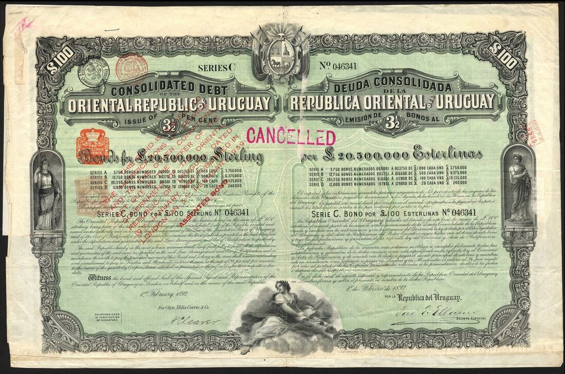 Uruguay, Oriental Republic: 1892 3½% Consolidated Debt, bond for £100, #046341, large format, coat of arms at top, allegorical figures in borders, green and black, text in English and Spanish, printed by Bradbury, Wilkinson & Co., stamped with 1939 modified terms, with replacement coupons, stamped CANCELLED. F-VF and scarce. The loan has been fully repaid and only a handful of cancelled bonds are known to exist in addition to a few specimens.