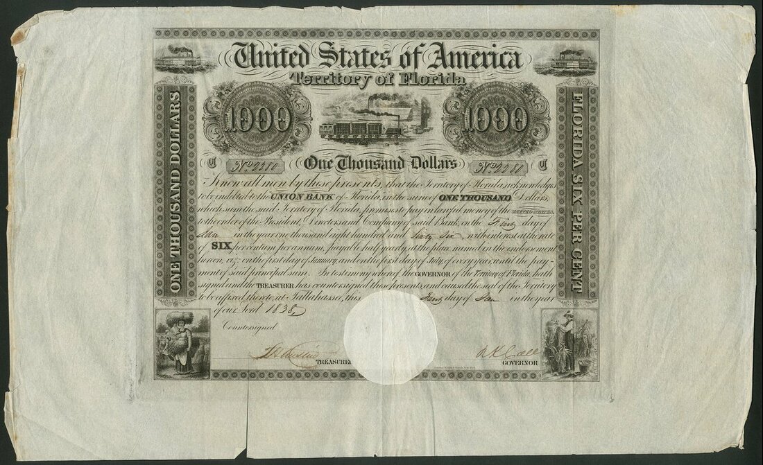 U.S.A.: Territory of Florida, 6% Loan, 1838, $1000 bond, #C2280, lovely piece with several vignettes including early steam train, woman gathering wheat and farmer picking crops, black, signed by R.K. Call as Governor, together with separate dividend warrants for getting interest paid in London. Creased, VF but cut at bottom edge.