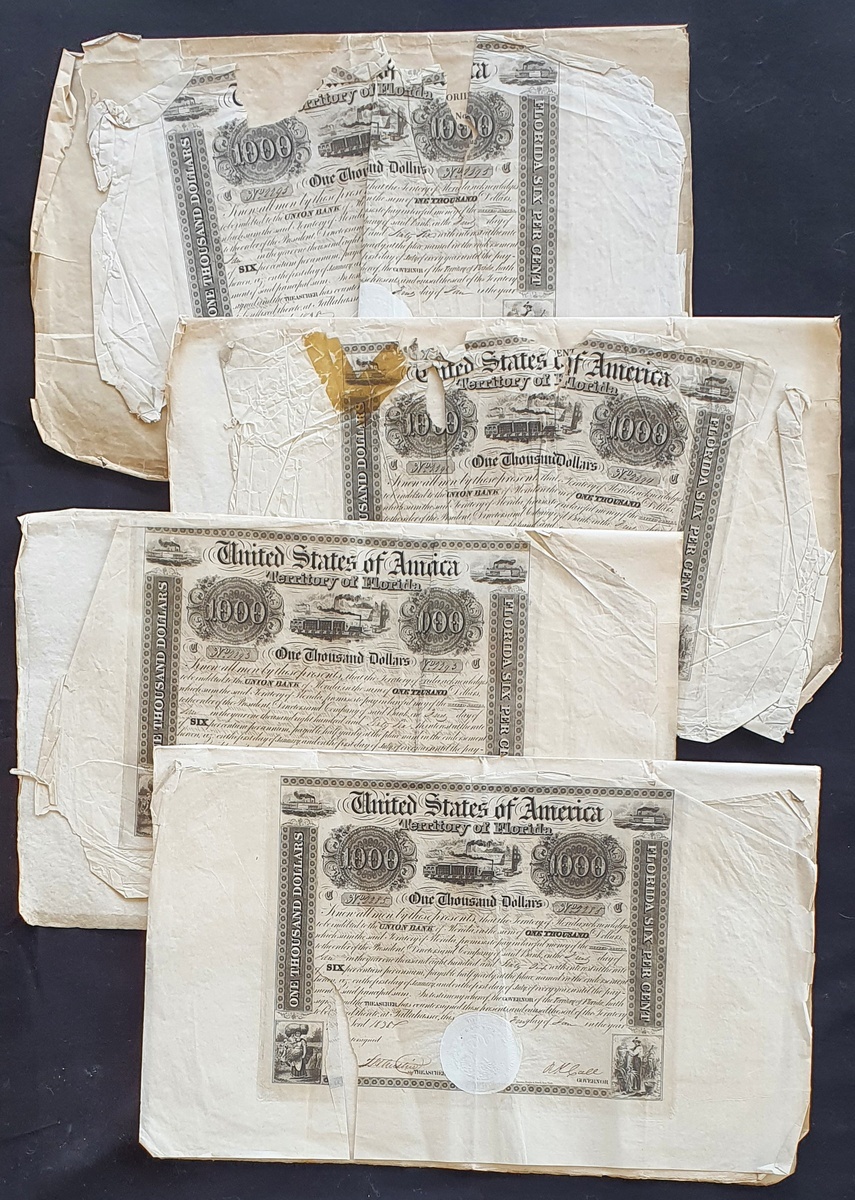 U.S.A.: Territory of Florida, 6% Loan, 1838, a group of four $1000 bonds, #C2285, #C2293-95, lovely pieces with several vignettes including early steam train, woman gathering wheat and farmer picking crops, black, signed by R.K. Call as Governor, together with separate dividend warrants for getting interest paid in London. Together with 2 sheets without the bonds, #2289, #2292. All with edge tears and creases, a couple with considerable damage (6).