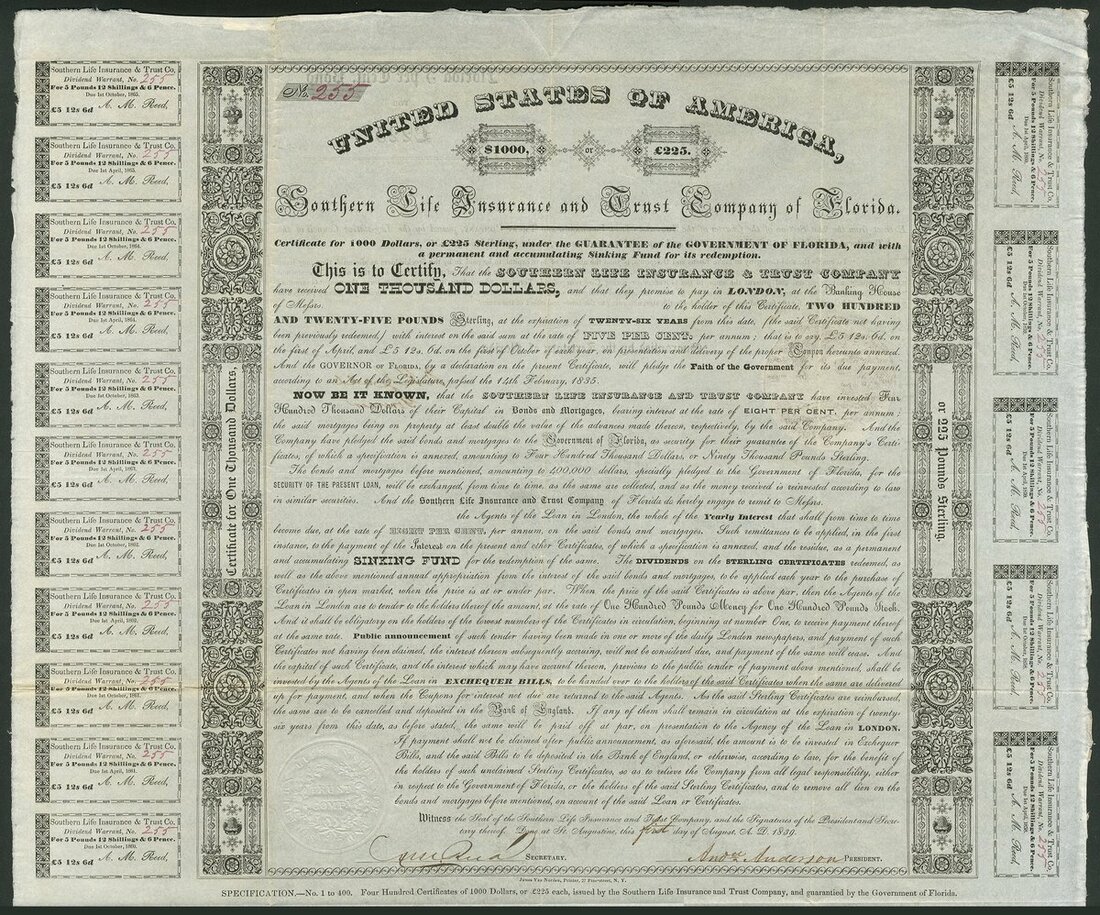 U.S.A.: Southern Life Insurance and Trust Company of Florida, 5% Loan, 1839, bond for $1000 or £225, #255, guaranteed by the Territory and handsigned by the governor R.K. McCall, attractive scrollwork at sides, large format, black, with coupons. Interest was payable in London. Only 400 issued. The company underwrote various insurances but operated mainly as a bank and also issued notes in the Territory. These bonds form part of the repudiated debt of the State of Florida. GVF and scarce early piece.