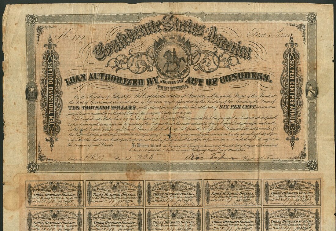Confederate States of America: Act of 17th February 1864, 6% bond, first series, $10,000, #199, equestrian statue of Washington, black with pink underprint, with ALL coupons (Ball 339/340). Numerous folds, split in centre, light staining and some foxing, VG but rare piece of which only 100 were issued accrding to Ball.
