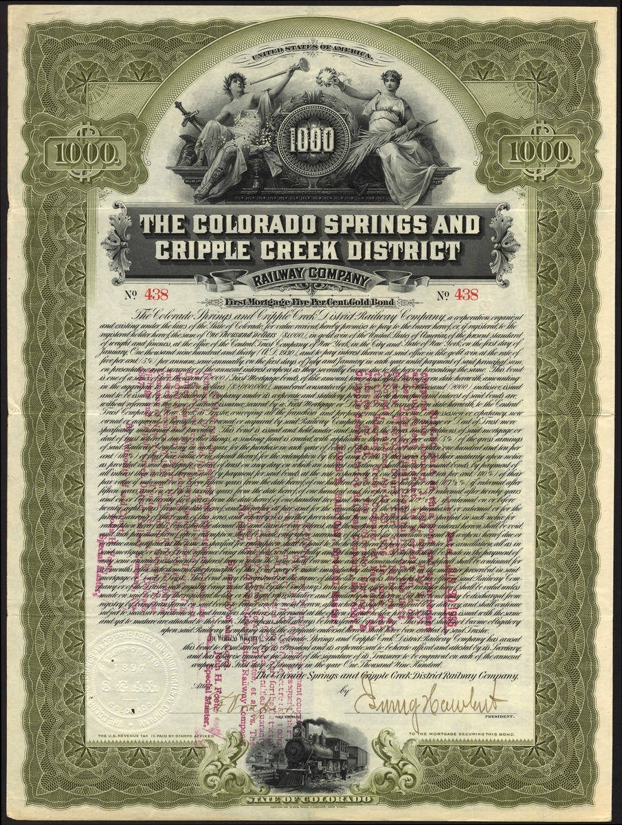 U.S.A.: Colorado Springs and Cripple Creek District Railway Co. (CO), first mortgage 5% gold bond for $1000, 1900, #438, allegorical females at top, train at bottom, ornate border, olive green and black, with coupons, cancelled. Various small pin holes, AVF.