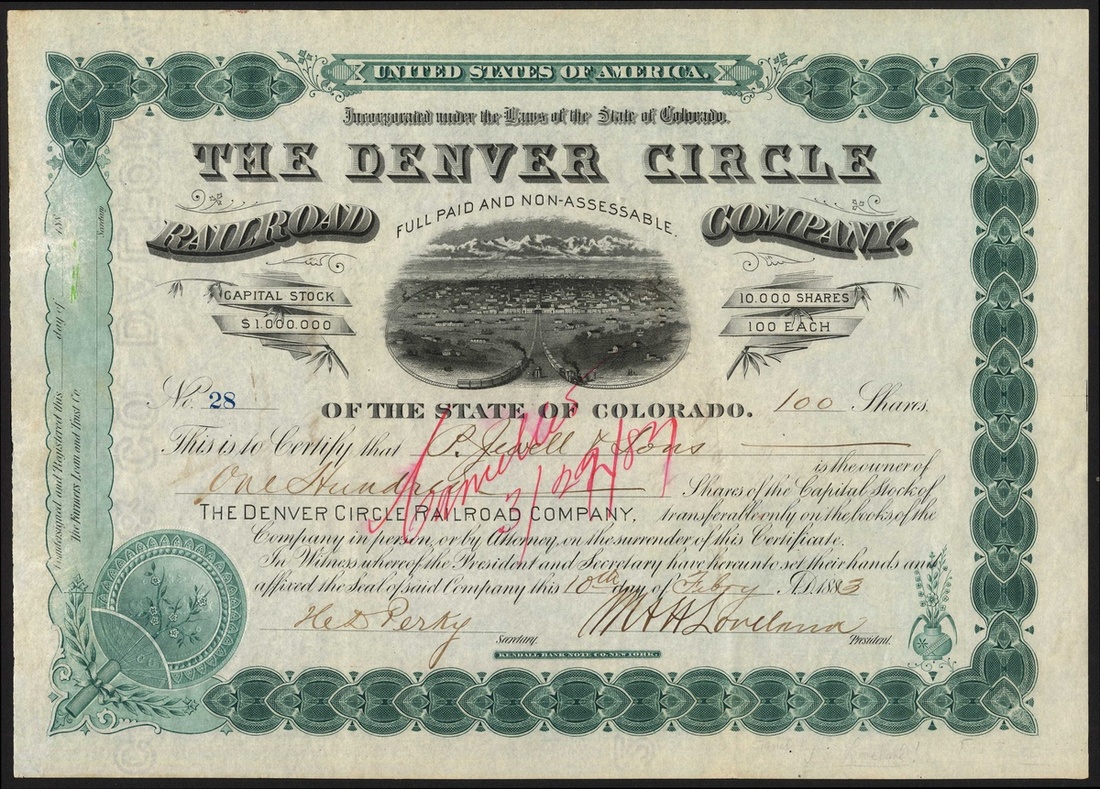 U.S.A.: Denver Circle Railroad Co. (CO), $100 shares, 188[3], #28, signed by William Loveland as President, vignette depicting Denver with mountain range behind, ornate border, green and black, embossed printed seal bottom left. William Loveland, 1826-1894, Narrow Gauge railroading pioneer. Slight damage to left side, otherwise VF.