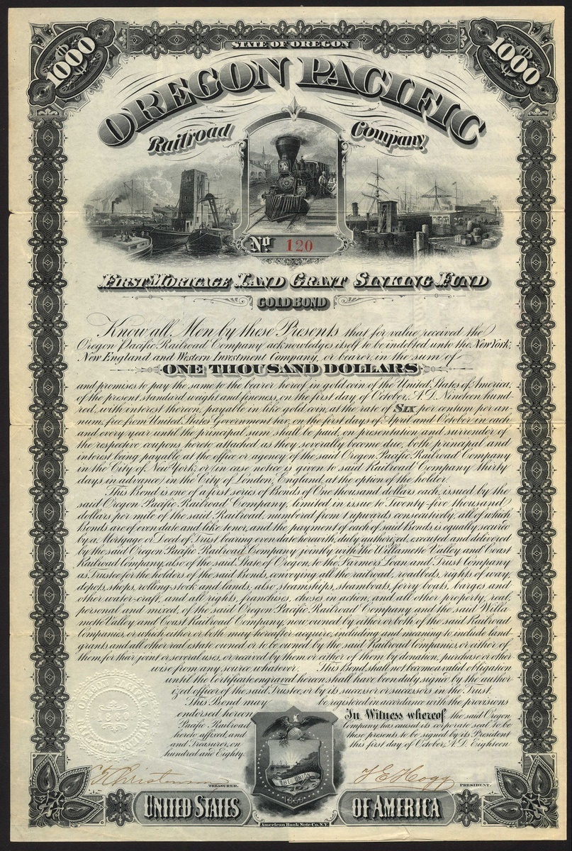 U.S.A.: Oregon Pacific Railroad Co. (OR), first mortgage land grant sinking fund Gold Bond for $1000, 1880, #120, signed by T.E.Hogg as President, front view of locomotive inset at top with dock scenes behind, ornate border, black, with coupons. Colonel Thomas Egerton Hogg was a rebel leader during the Civil War. He was sentenced to hang for attempting to rob ships coming into California whilst under the Confederate flag. It was commuted to life imprisonment but he was released under the general amnesty of 1866. In 1872 he reappeared in Corvallis and managed to incorporate and build the Corvallis & Yaquina Bay Railroad, later renamed the Oregon Pacific. The company failed due to mismanagement becoming bankrupt in 1890. Although Hogg was appointed receiver he was removed in 1893 and the line sold to the Oregon Central. Small edge tears to left where folded, otherwise VF.