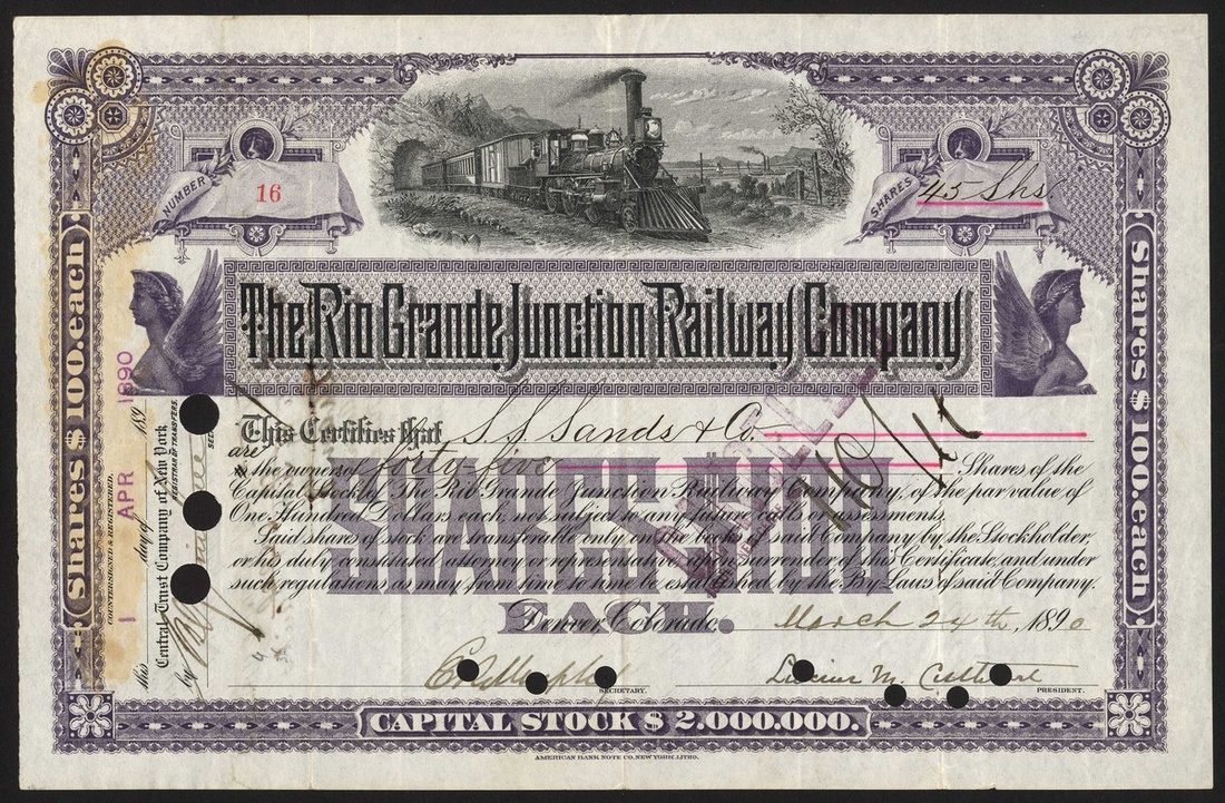 Rio Grande Junction Railway Co. (CO), $100 shares, 189[0], #16, steam train leaving tunnel at top, ornate border, purple and black, hole cancelled. Founded in 1889 the company was later leased to the Denver and Rio Grande Railroad. Stain to left side, some ink burning from reverse, AVF.