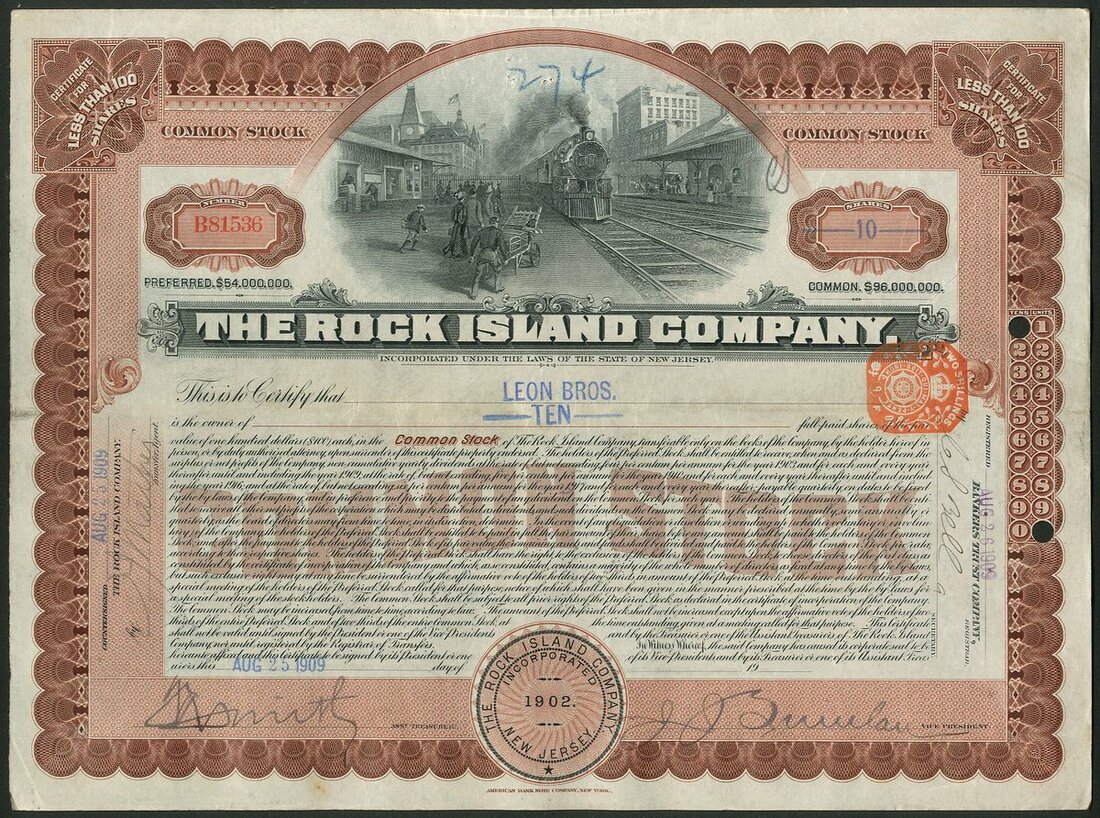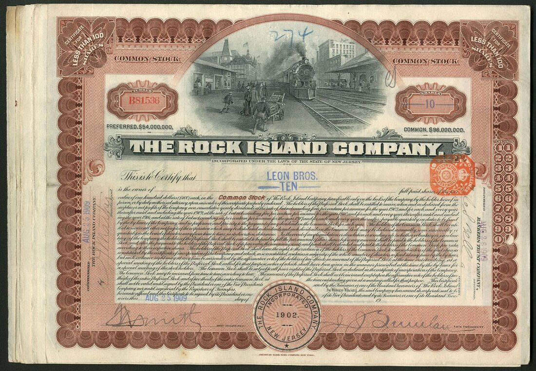 U.S.A.: Rock Island Company (New Jersey), a group of 16 certificates for less than 100 shares common stock, 19[09], steam train at station, brown & black. Generally VF and better (16).