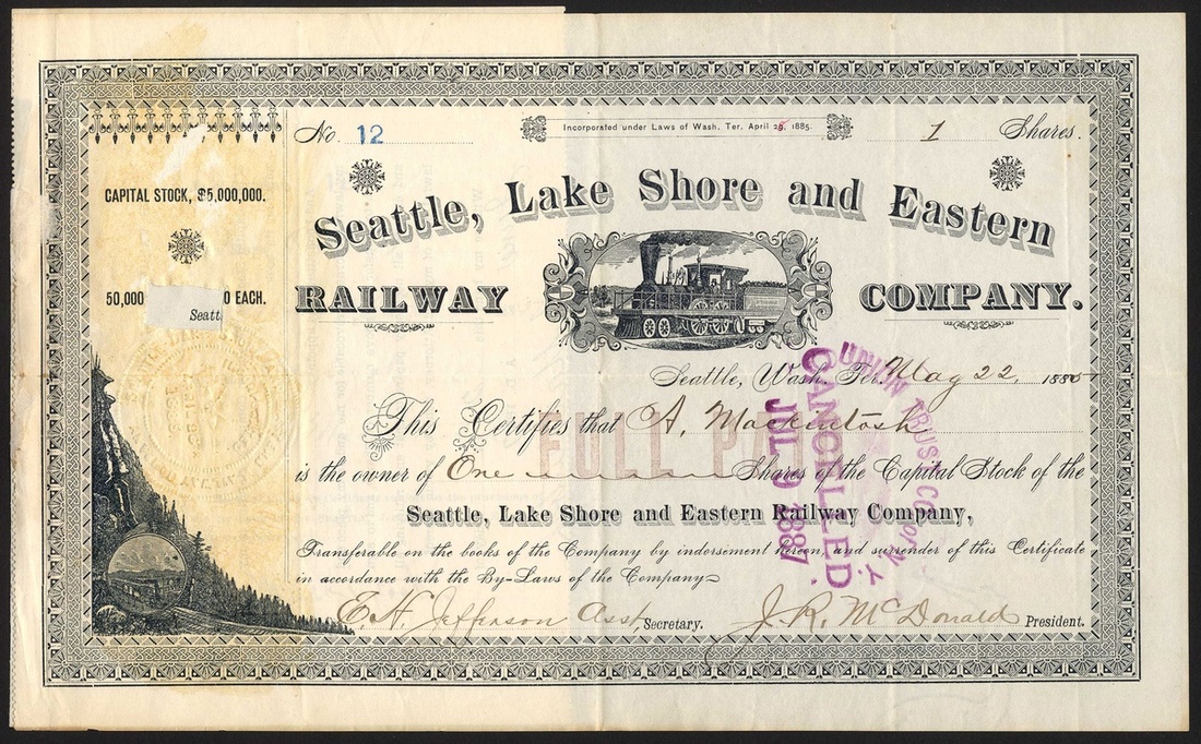 U.S.A.: Seattle, Lake Shore and Eastern Railway Co. (WA Terr.), $100 shares, 188[5], #12, steam train in centre, mountain scene in lower left corner, black, counterfoil reglued at left, stamped cancelled. Glue residue on face at left quarter with some paper adhesion, hole cancel just above seal, VF and scarce.
