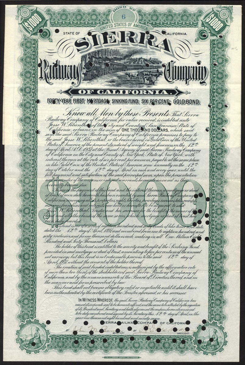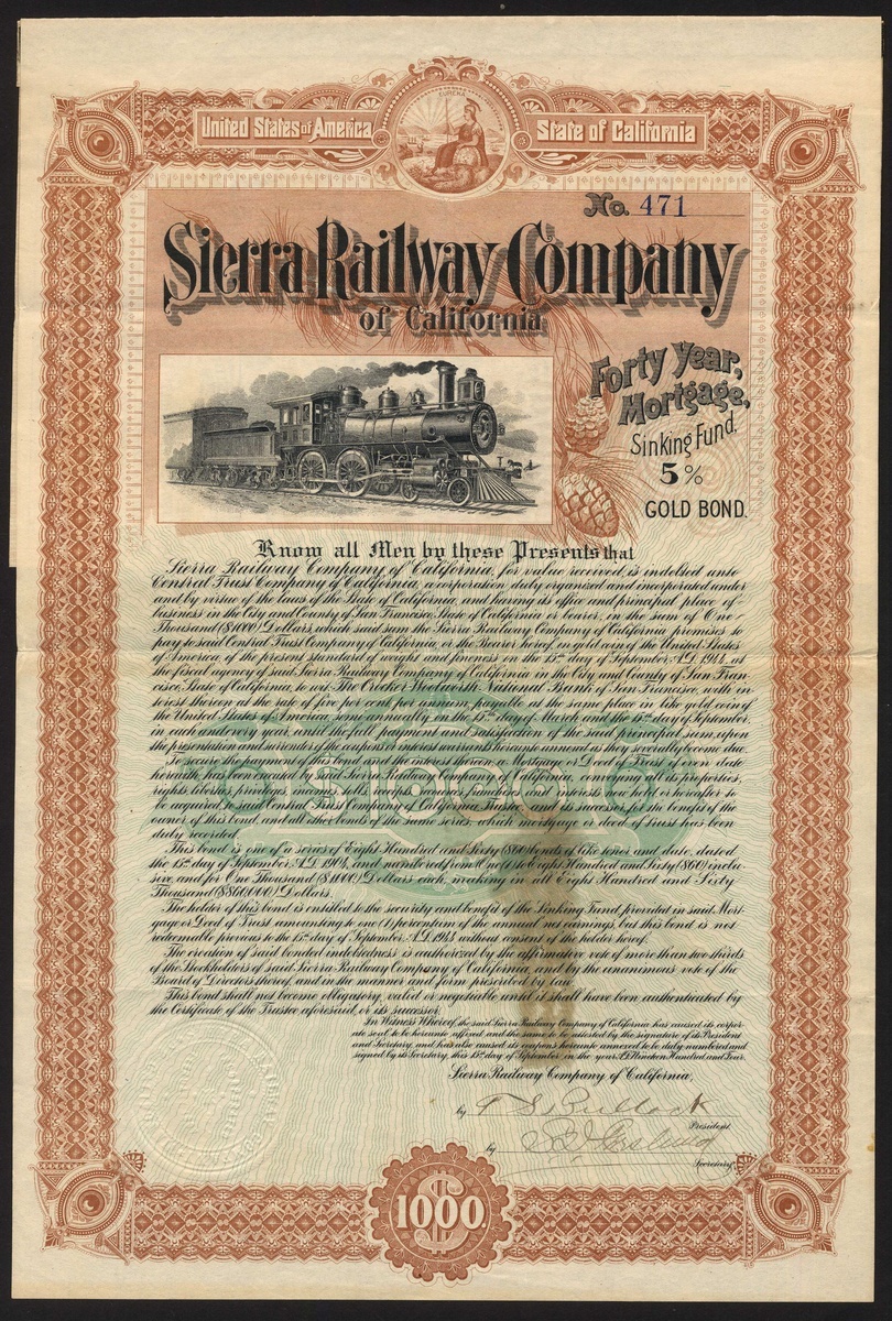 U.S.A.: Sierra Railway Co. of California, 40yr first mortgage sinking fund 6% Gold Bond, $1000, 1897, #6, steam train passing cattle at top, ornate border, green and black, hole cancelled, together with 40yr mortgage sinking fund 5% Gold Bond, $1000, 1904, #471, steam train inset at top left, ornate border, brown, both with coupons. The second with stain in centre of bottom half, otherwise AVF. (2)