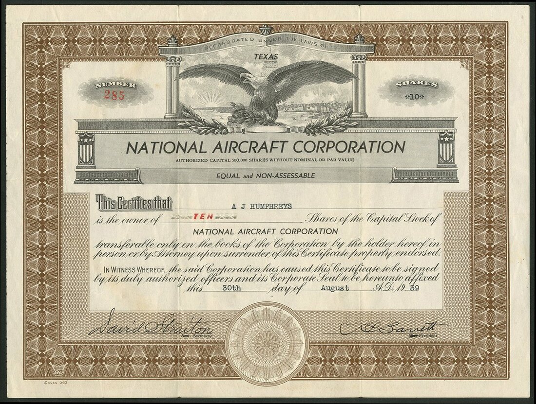 U.S.A.: National Aircraft Corporation, Texas, 10 shares, 19[39], #285, eagle at top, brown and black. Formed in Texas in 1939 to build basic and training aircraft for the military. Initially the factory was to be in Fort Worth but it was later changed to San Antonio where ground was broken in May 1939.