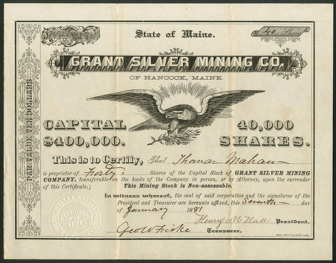 U.S.A: Grant Silver Mining Co., of Hancock, Maine, $10 shares, 18[81], #217, black with large Eagle in centre. Incorporated in maine in 1879. VF.