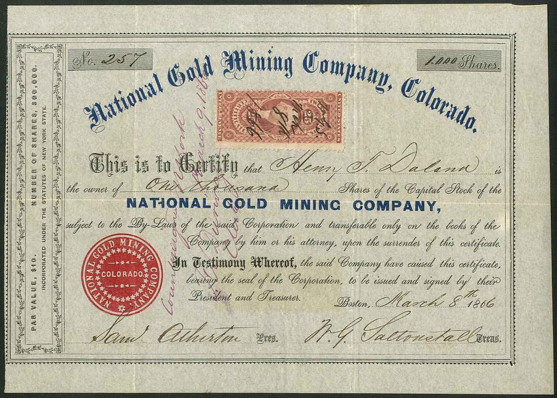 U.S.A.: National Gold Mining Co. (NY), $10 shares, Boston 186[6], #257, fine border, black and blue, red company seal. VF and early date.