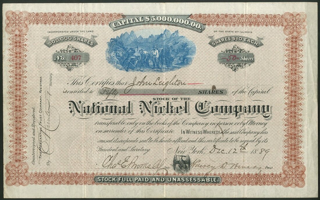 U.S.A.: National Nickel Company, $10 shares, 18[89], #407, miners at work, blue, black and brown. Incorporated in Illinois in August 1886 to work extensive rich nickel mines near Lovelock, Nevada, VF and scarce.