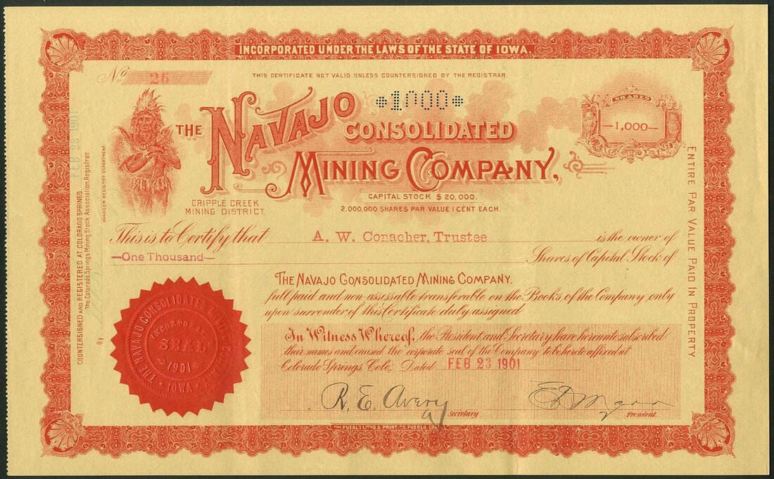U.S.A.: Navajo Consolidated Mining Company, 1 cent shares, [1901], #26, native American at left, red on yellow paper. Incorporated in Iowa to acquire mines in the Cripple Creek District, Colorado. EF.